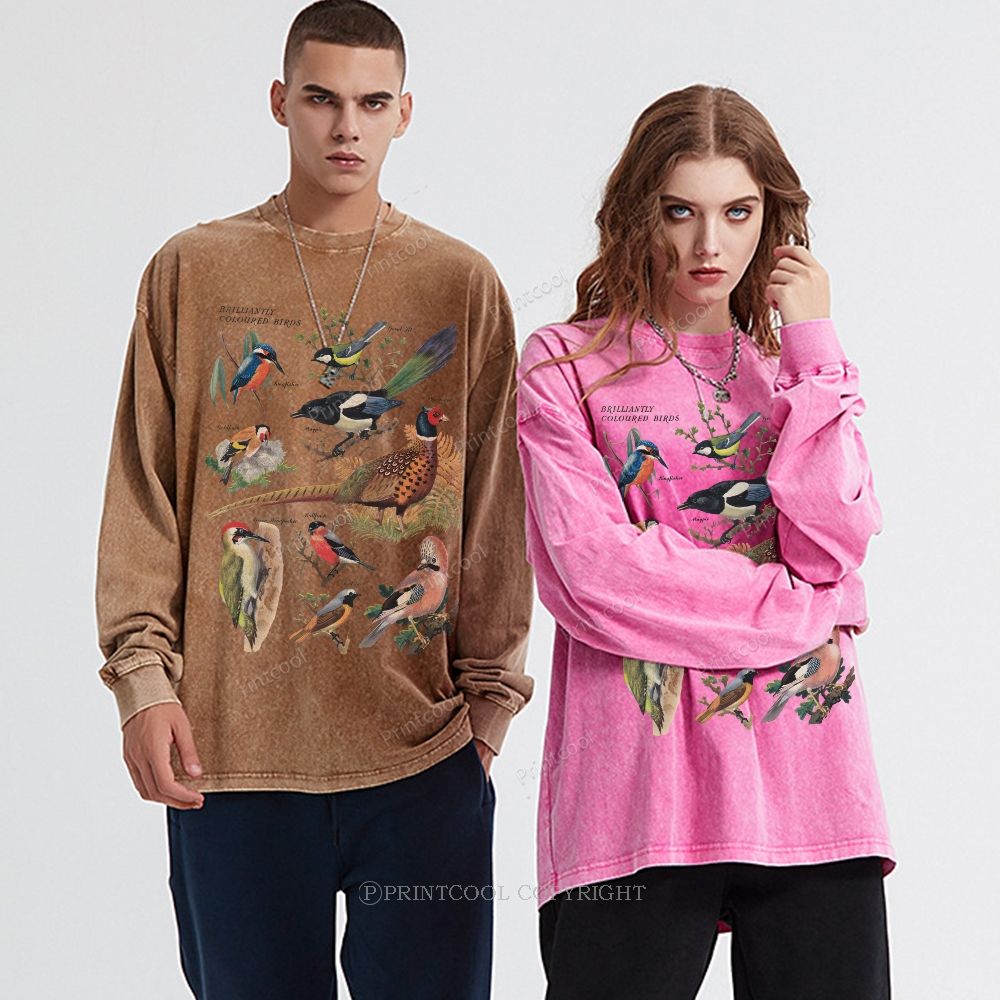 Retro Ornithology Birds Identification Unisex Casual Washed Printed Long Sleeve T-shirt