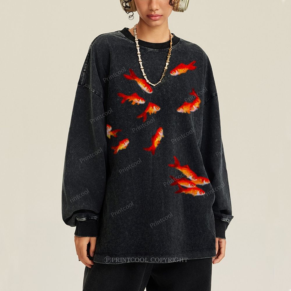 Lots Of Cute Wii Fish Unisex Casual Washed Printed Long Sleeve T-shirt
