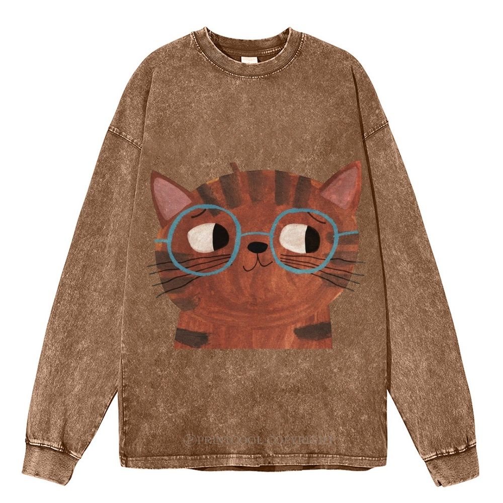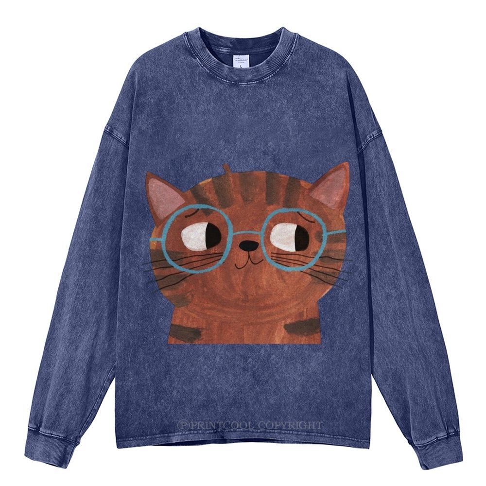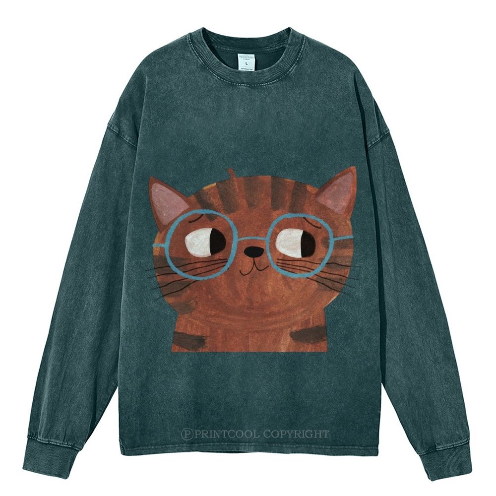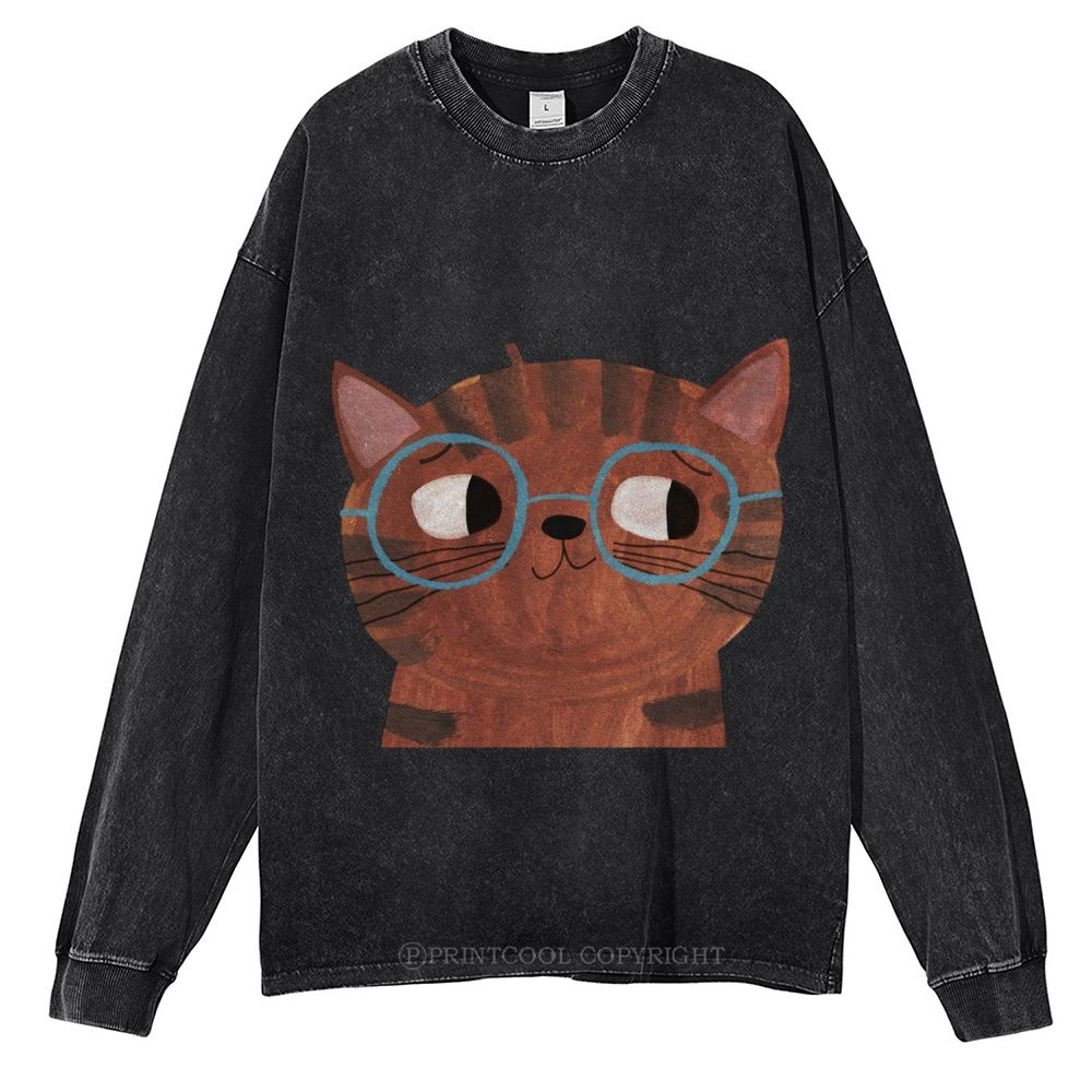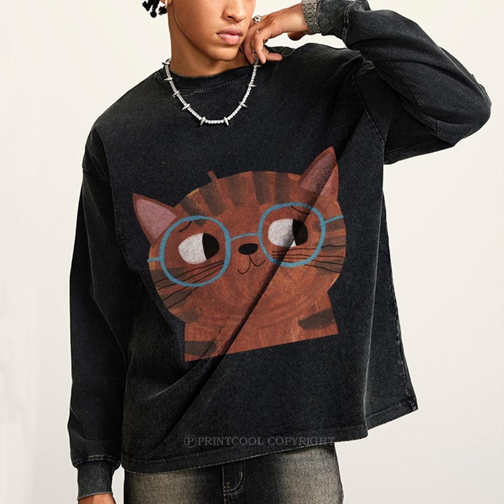 Bad-Hearted Cat Unisex Casual Washed Printed Long Sleeve T-shirt