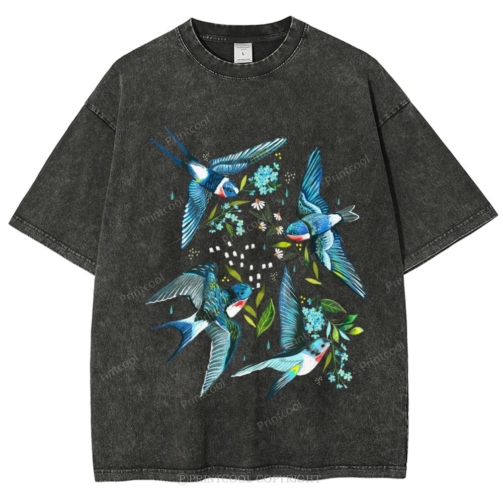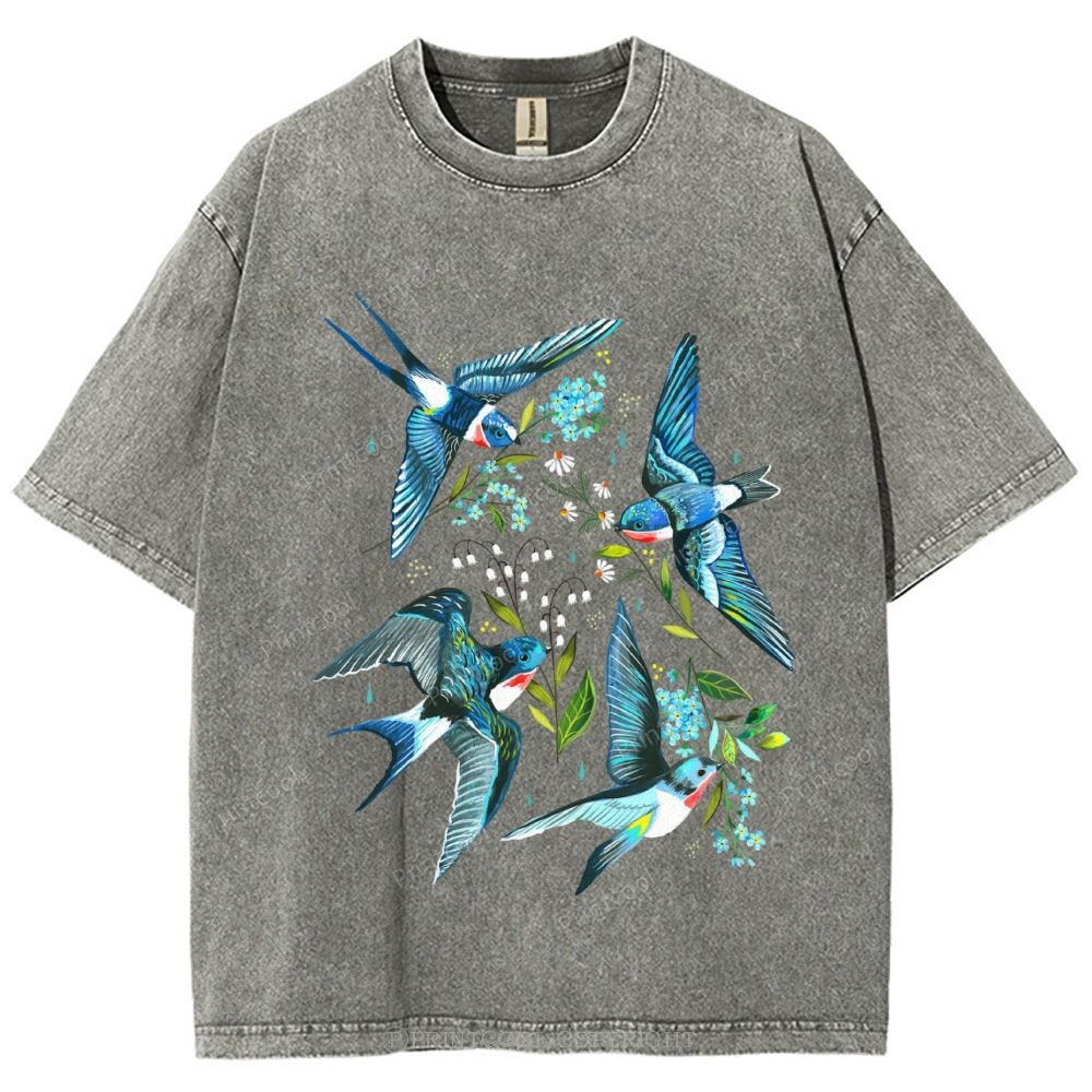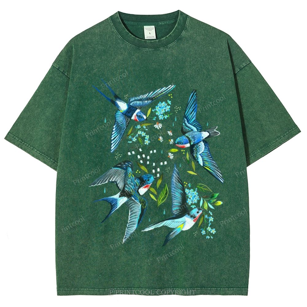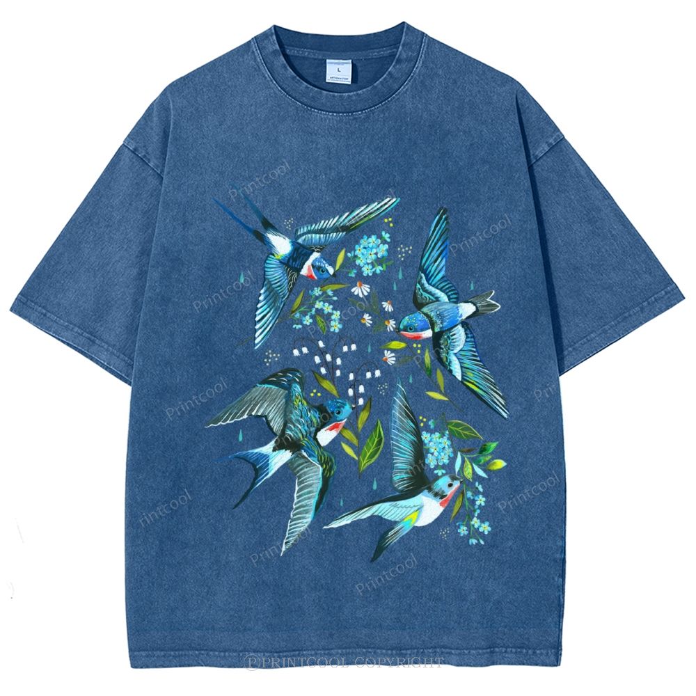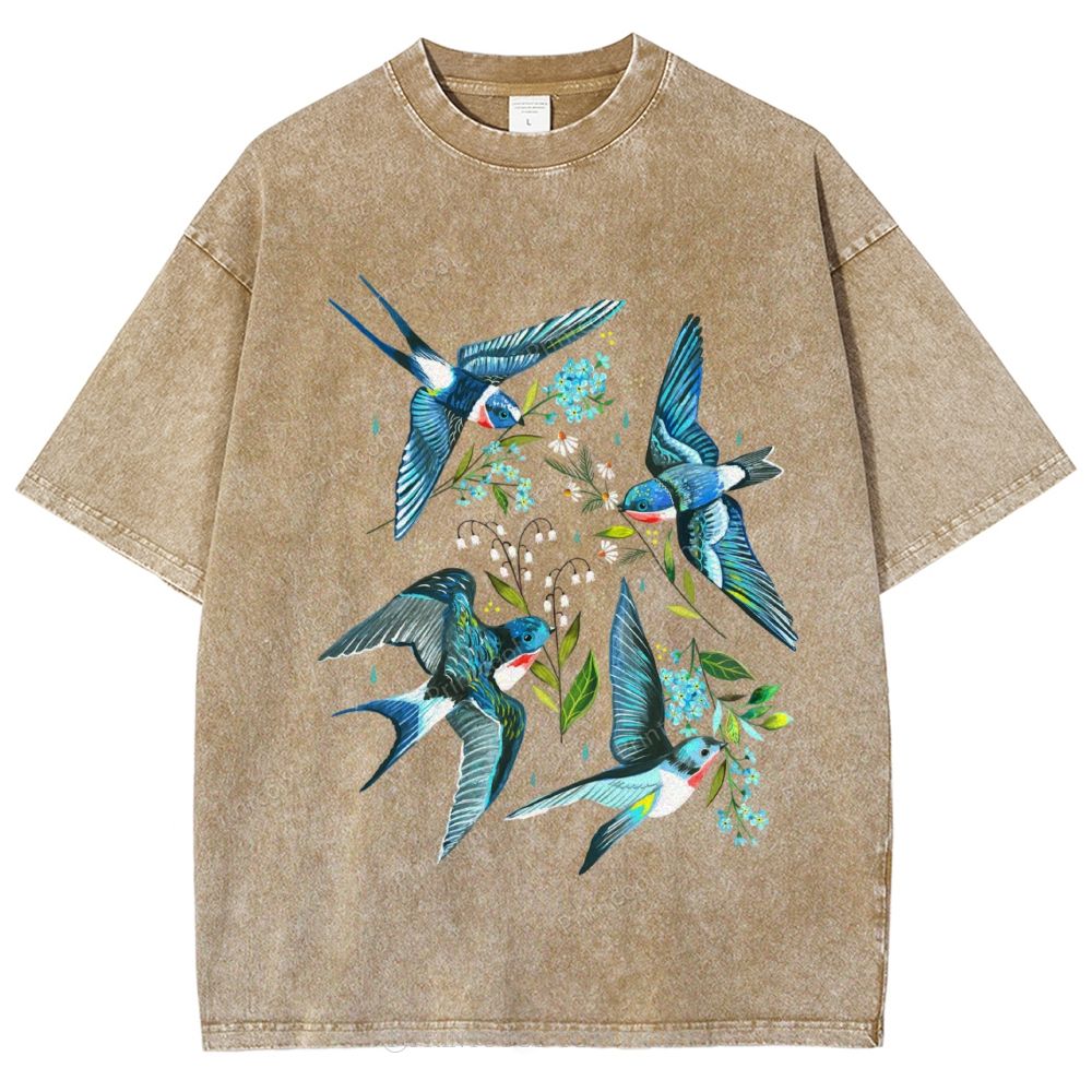 Botanical Flying Swallows Graphic Unisex Vintage Washed Tee