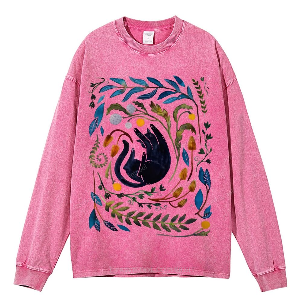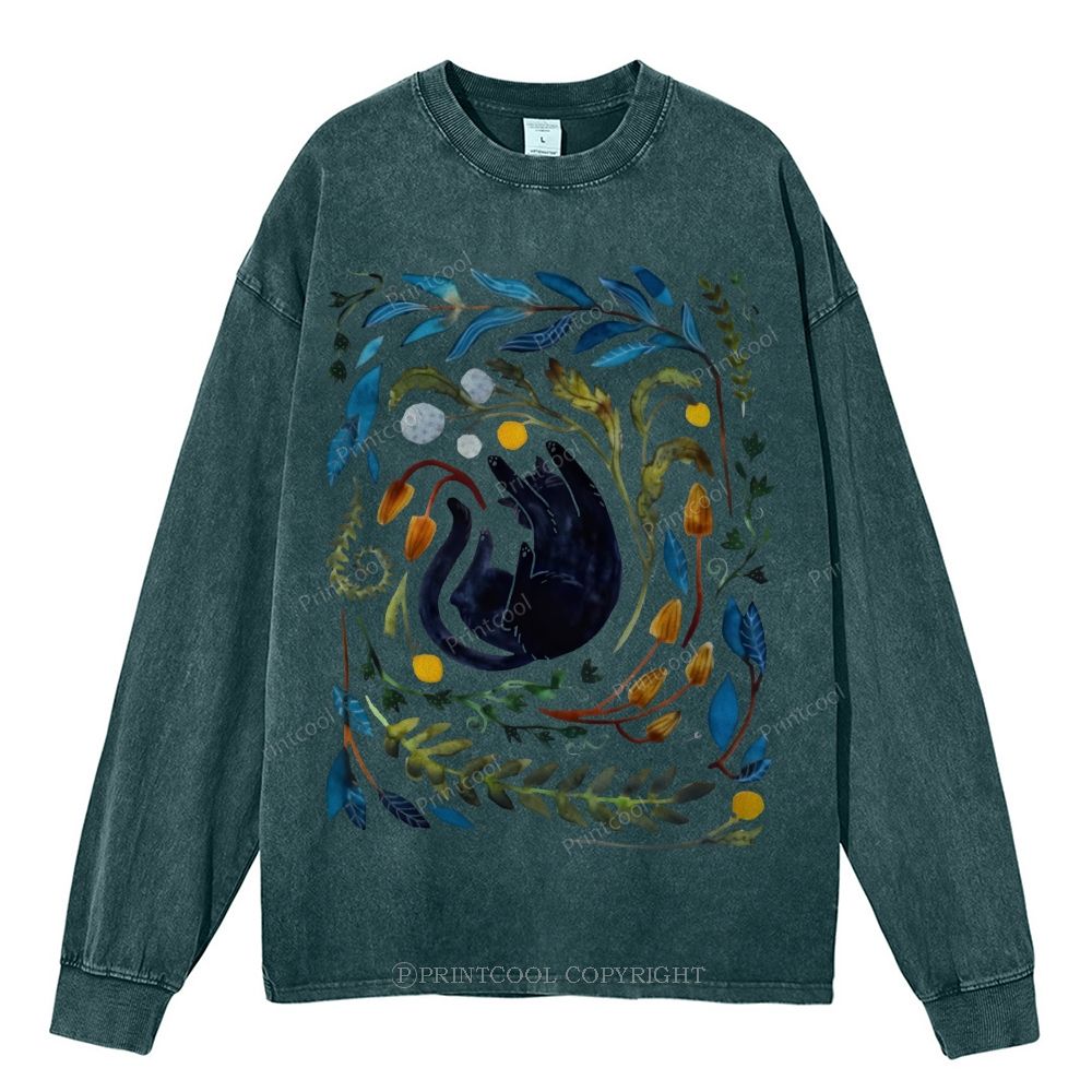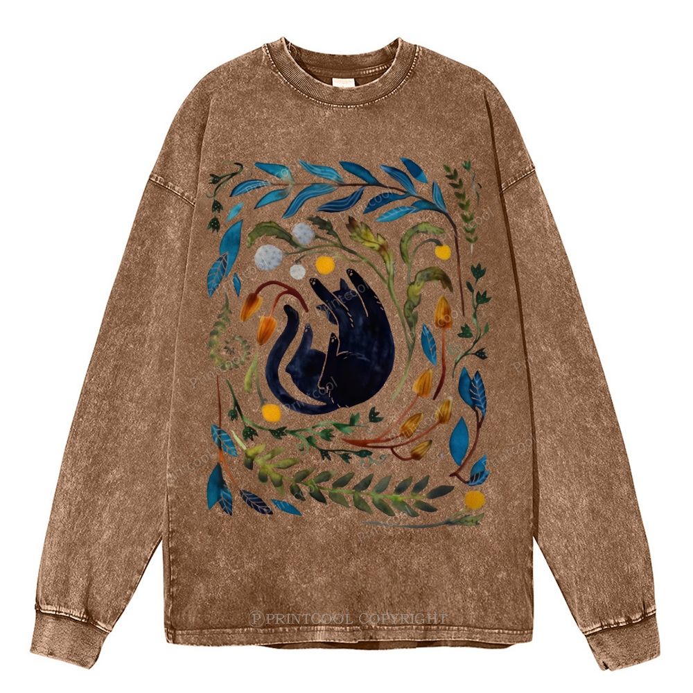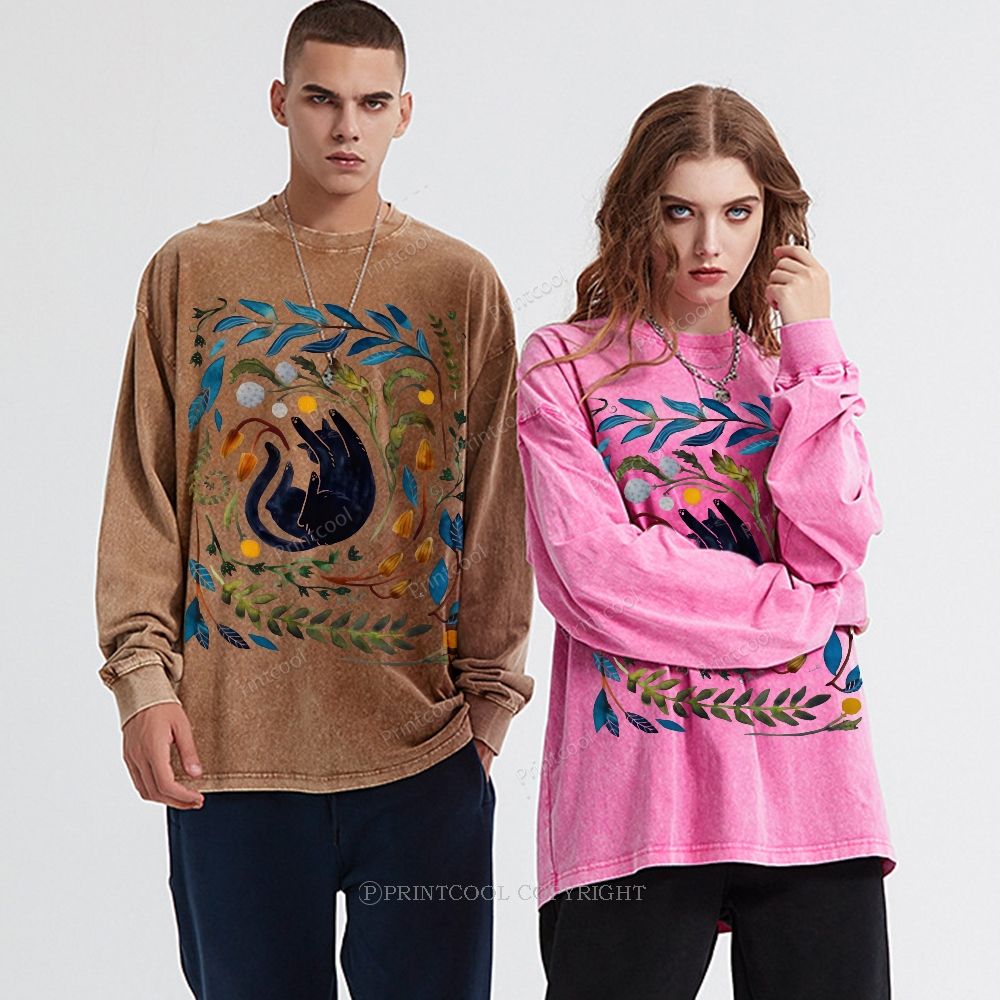 Cat In The Leaves Unisex Casual Washed Printed Long Sleeve T-shirt
