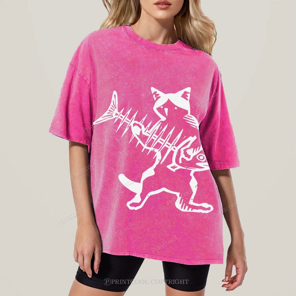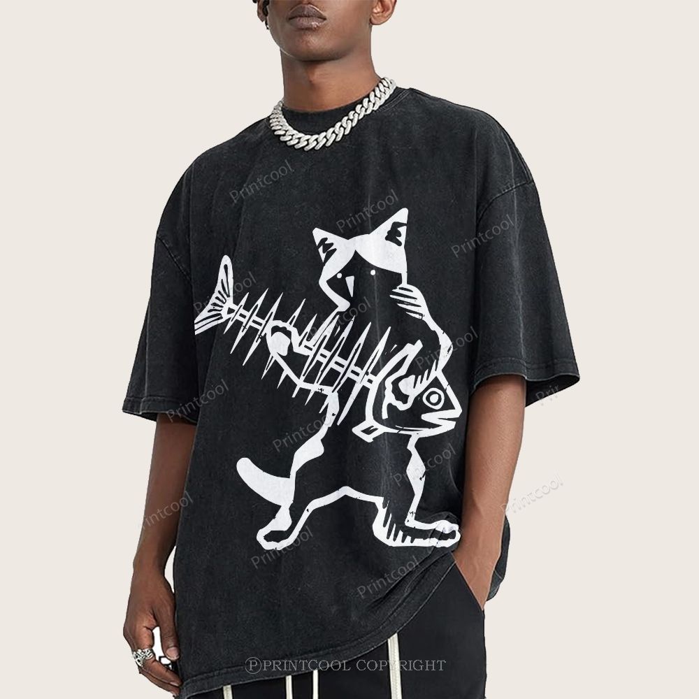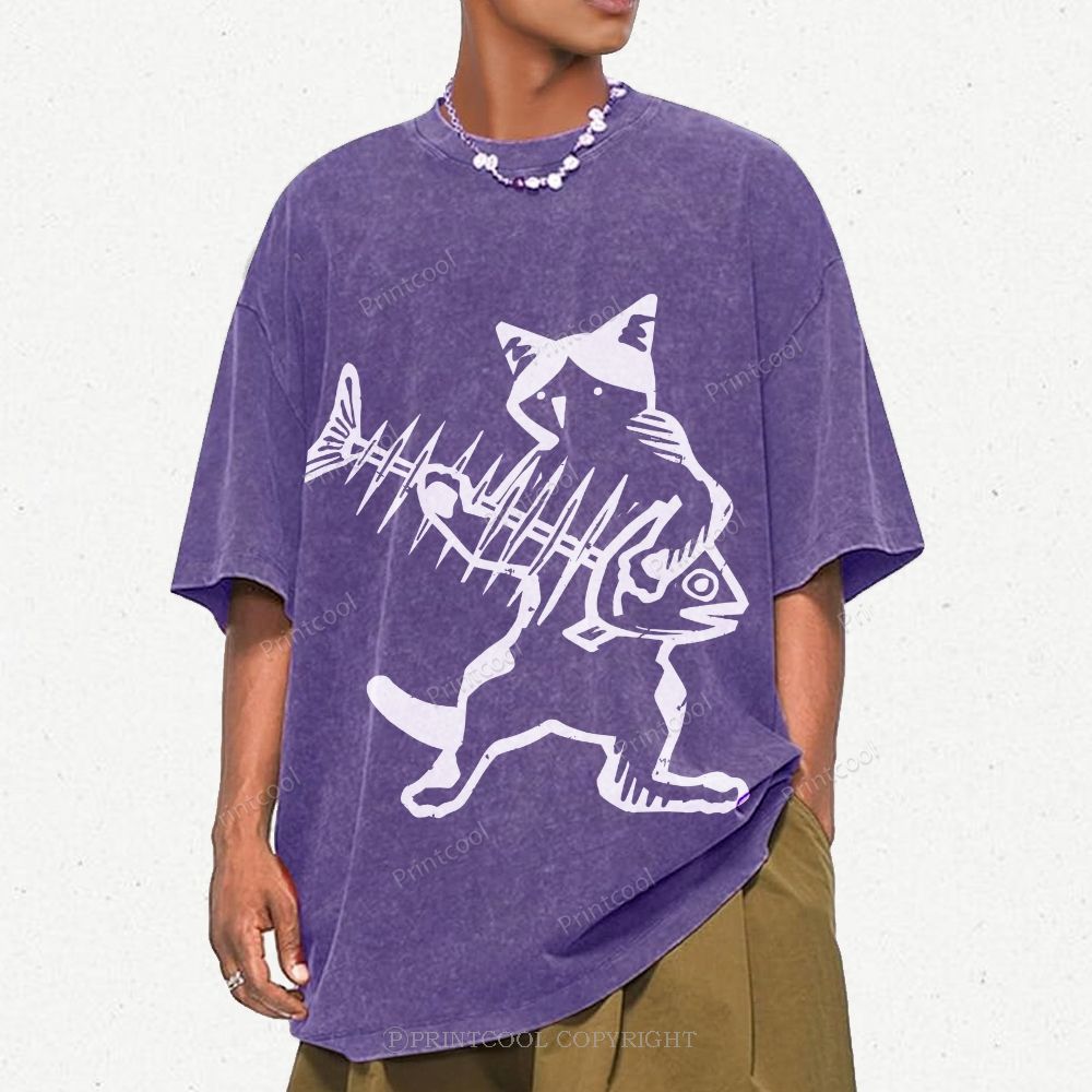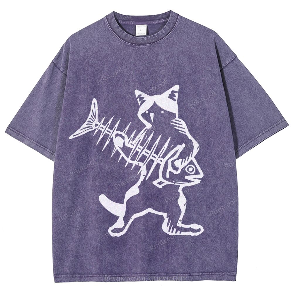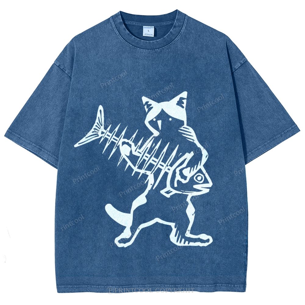 Cat With Fish Guitar Unisex Vintage Washed Tee