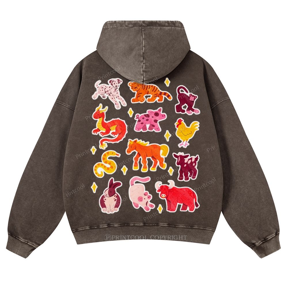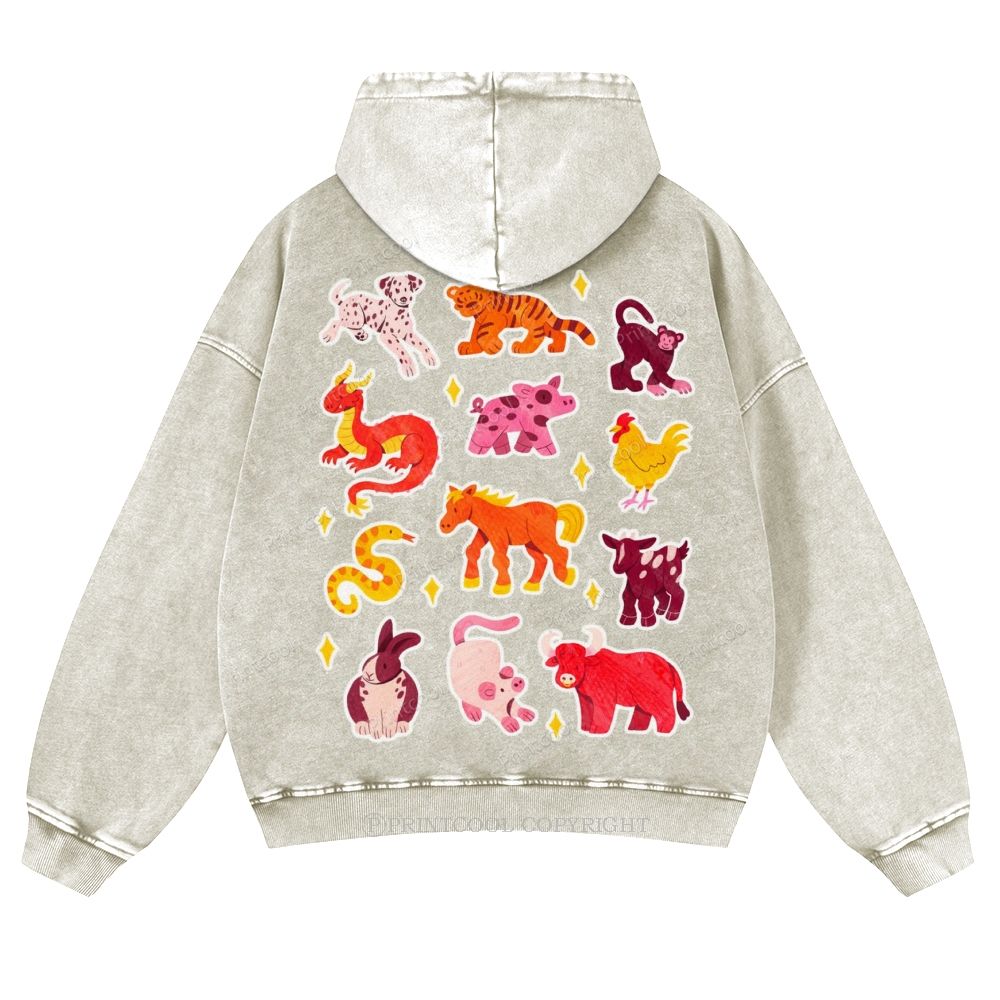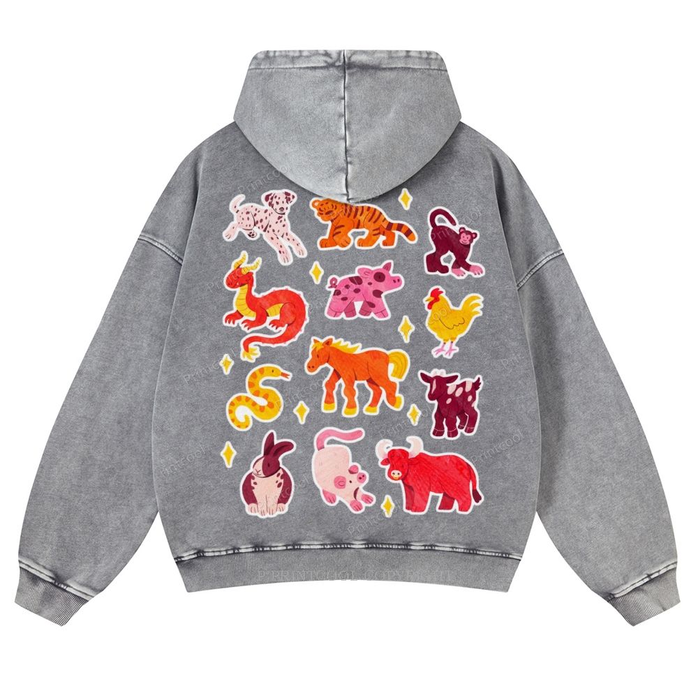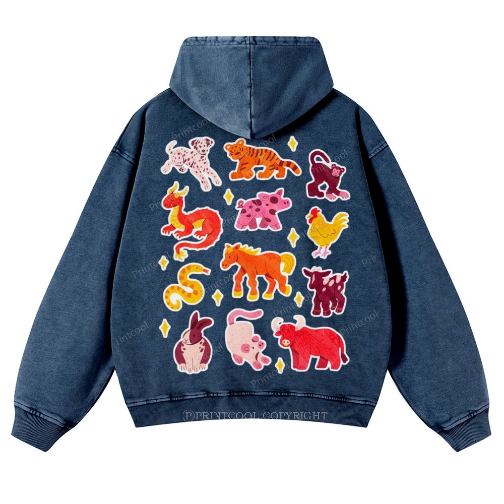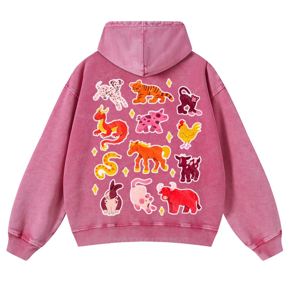 Colorful Animal Sticker Pack Casual Washed Hoodie