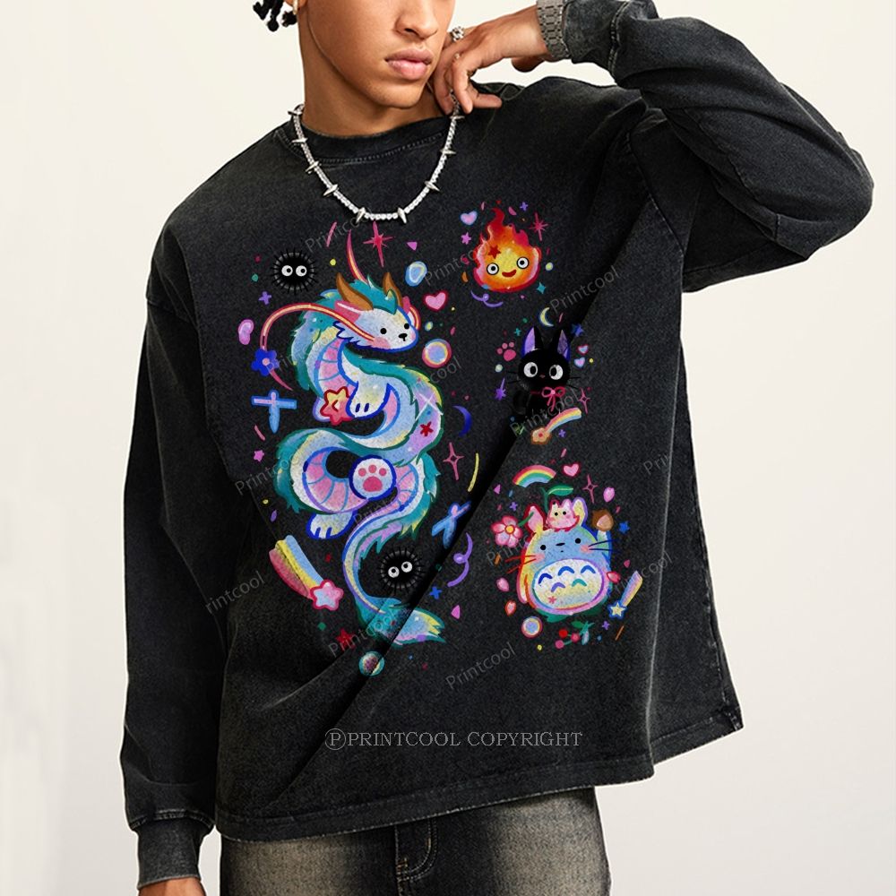 Colorful Ghibli Creatures Unisex Casual Washed Printed Long Sleeve T-shirt