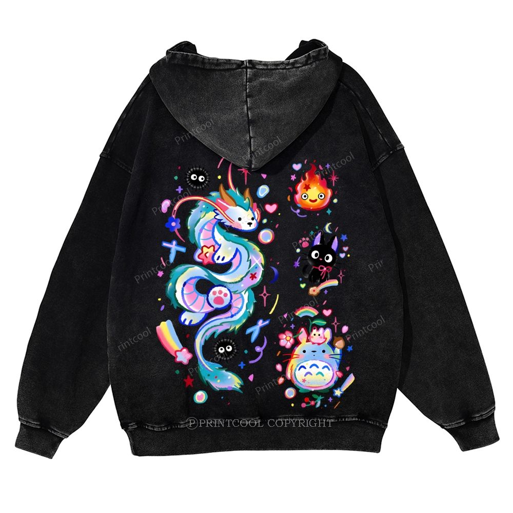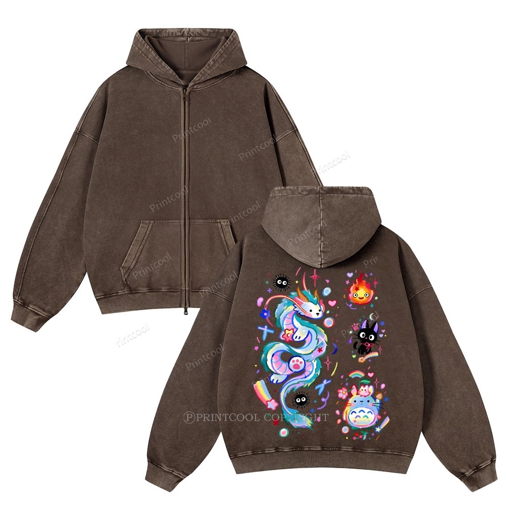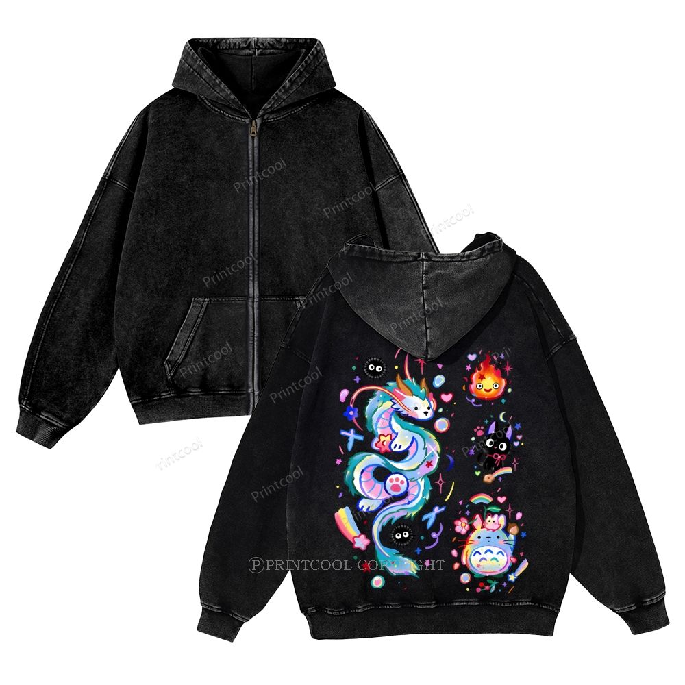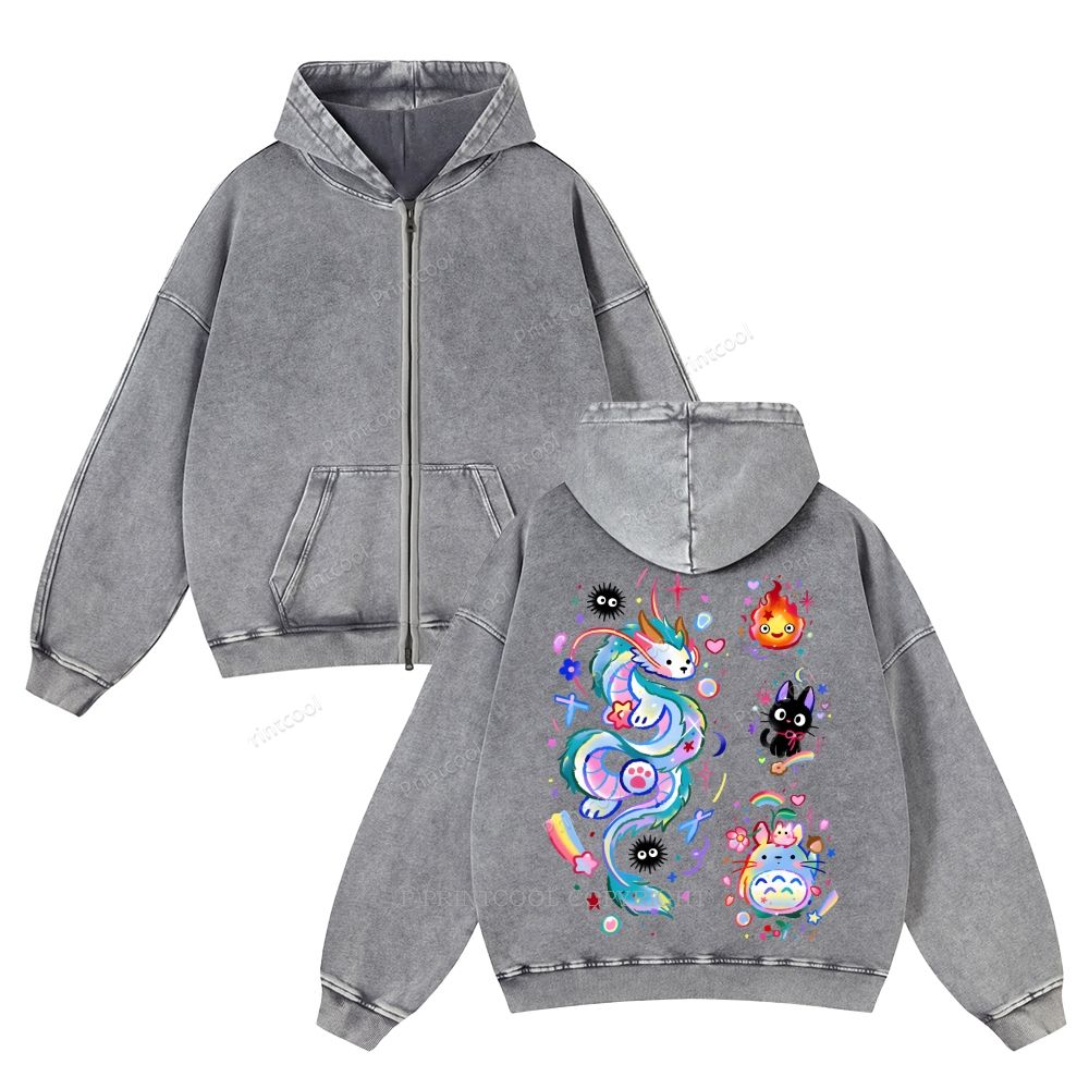 Colorful Ghibli Creatures Unisex Washed Cotton Zip Up Hoodie