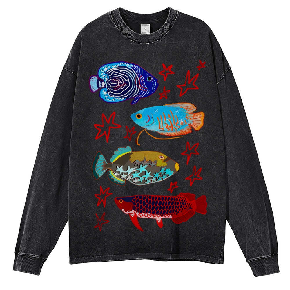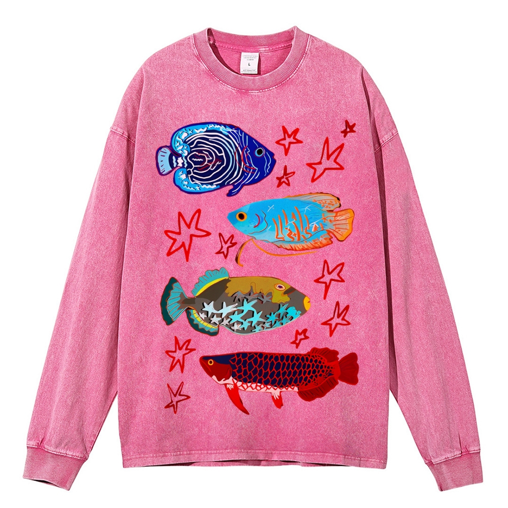 Cute Colorful Fish Unisex Casual Washed Printed Long Sleeve T-shirt