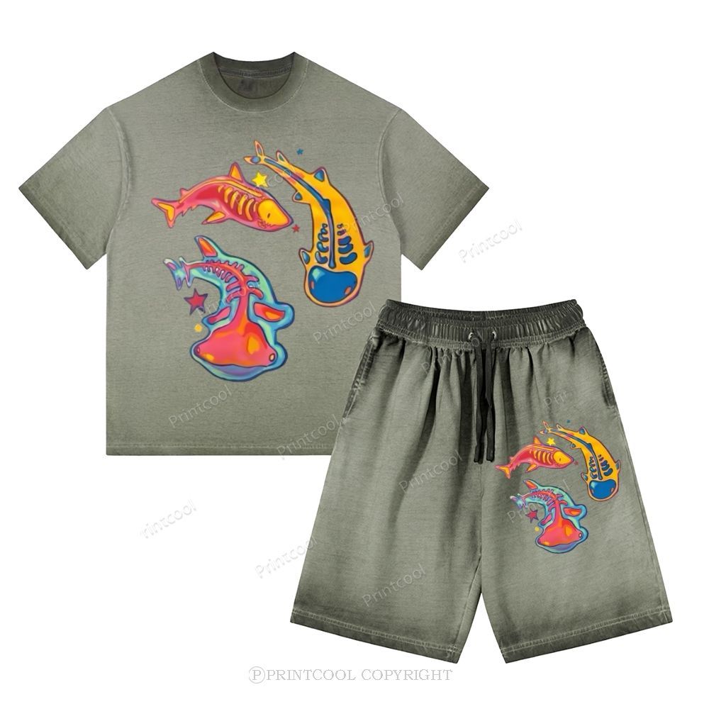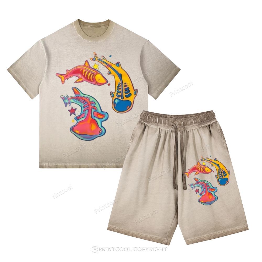 Enigma of Sharks Back Print Washed Tee&Shorts Set