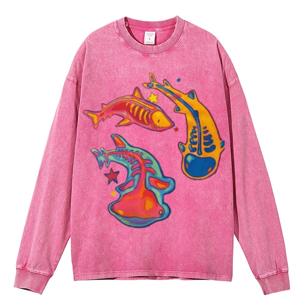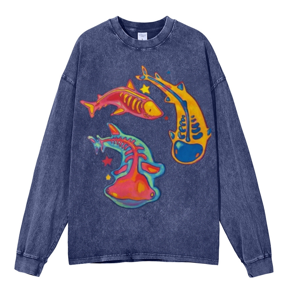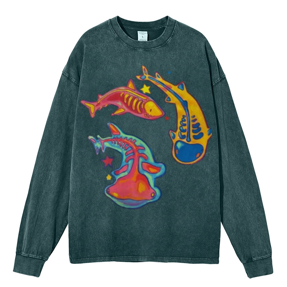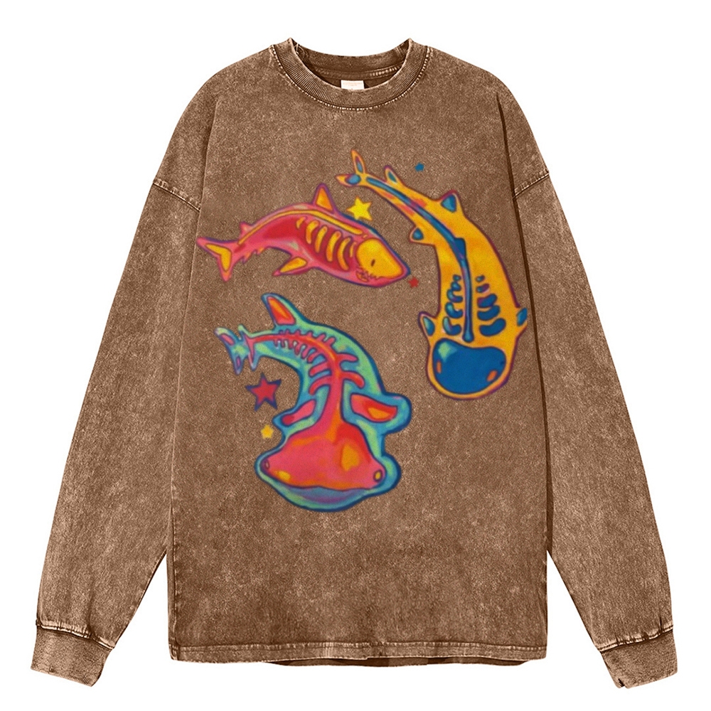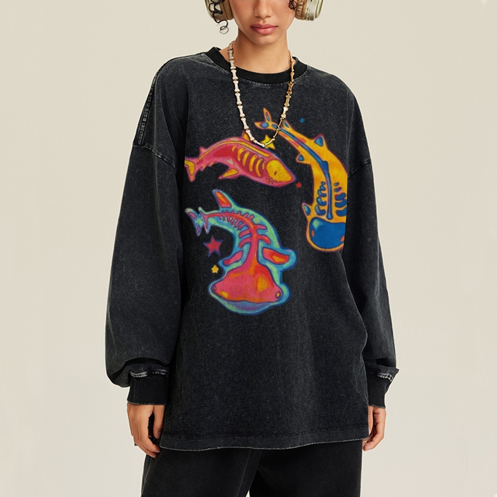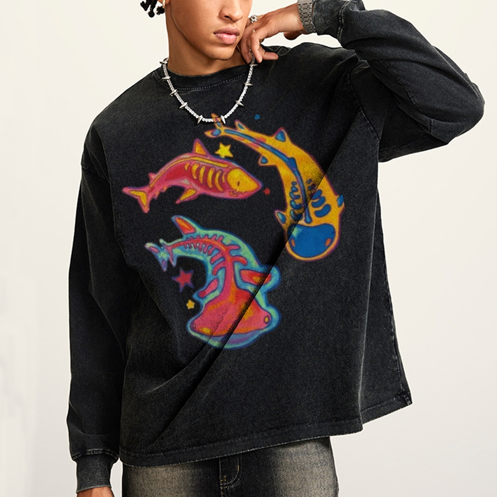 Enigma of Sharks Unisex Casual Washed Printed Long Sleeve T-shirt