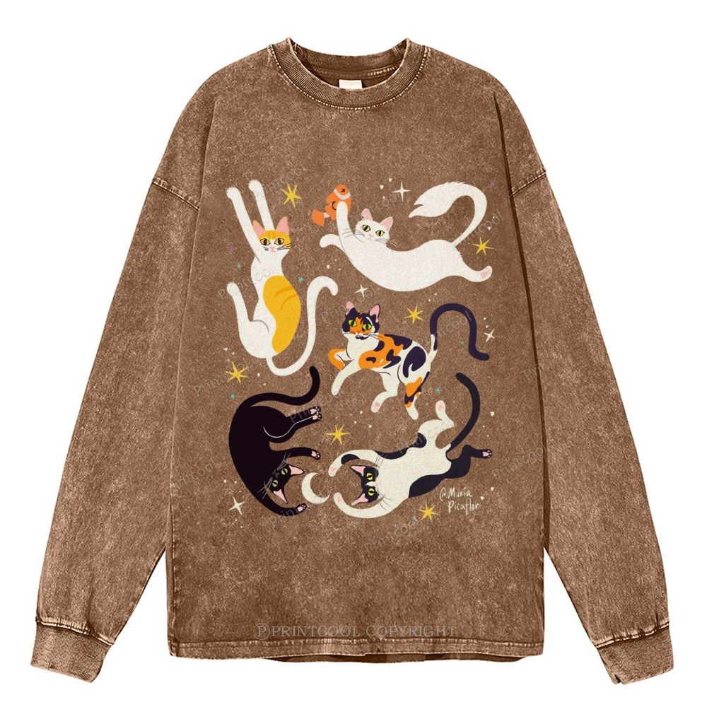 Five Cats Unisex Casual Washed Printed Long Sleeve T-shirt