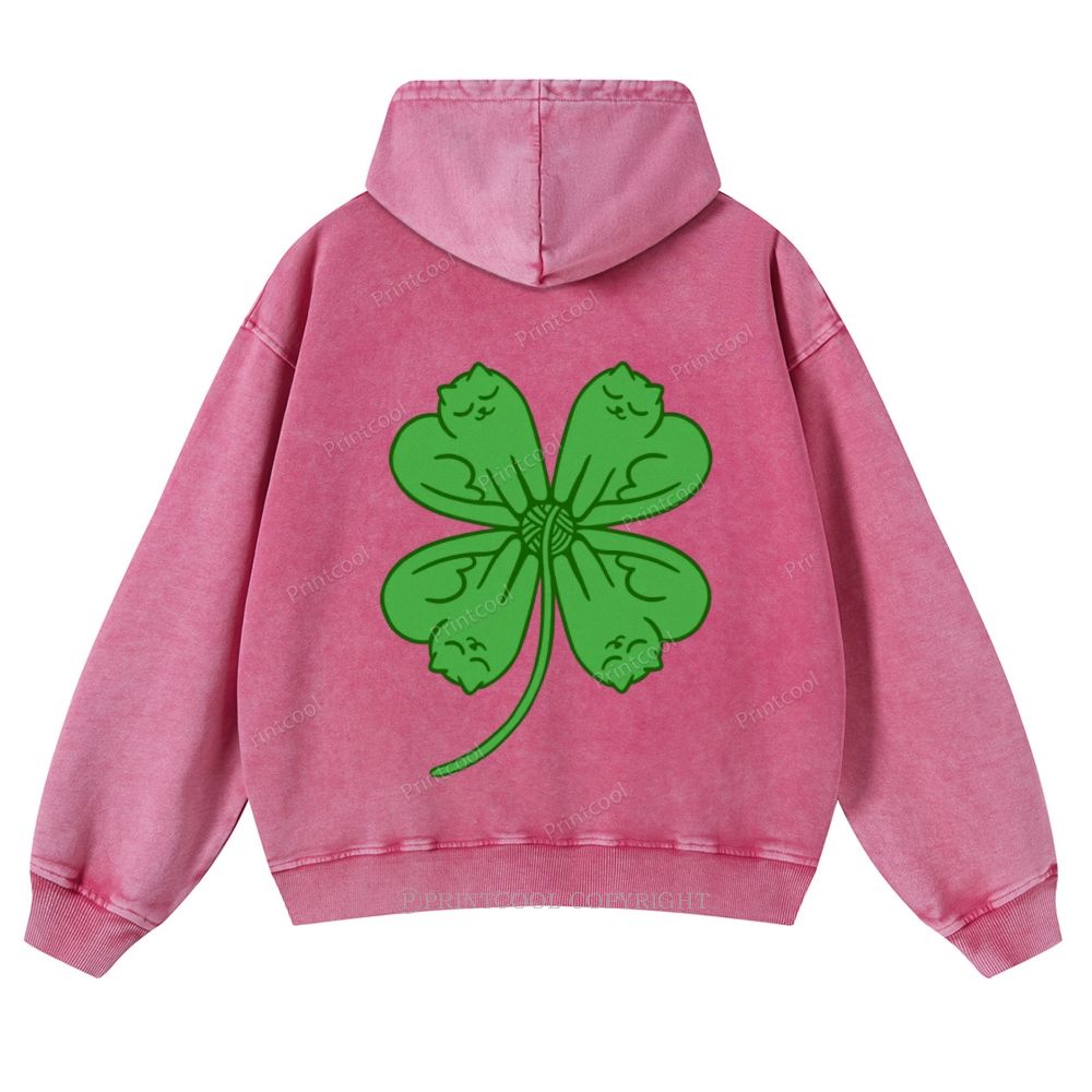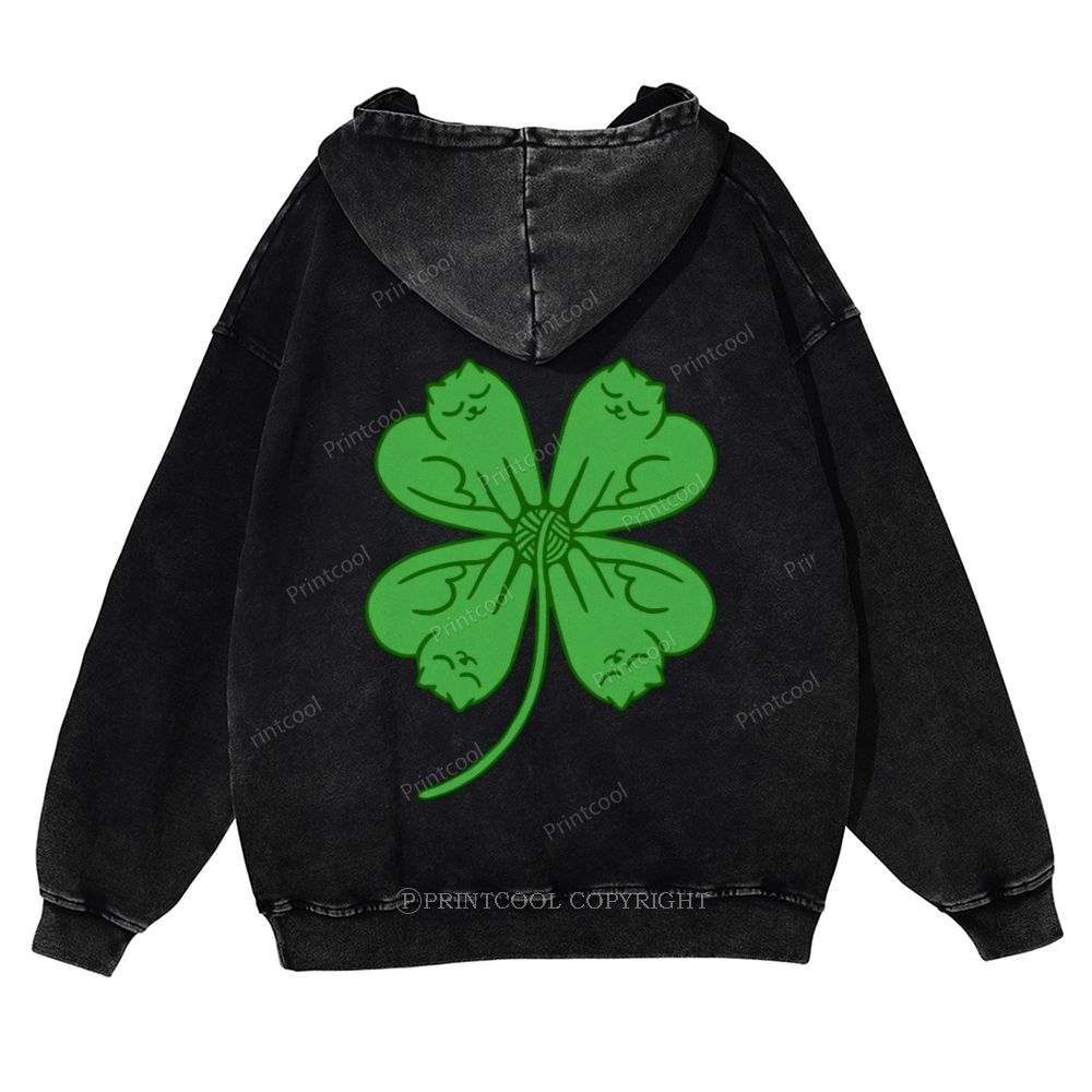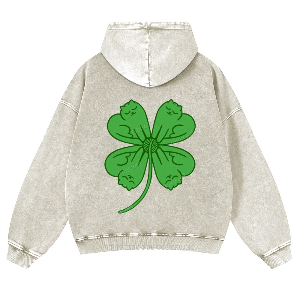 Four Leaf Clover Cat Casual Washed Hoodie