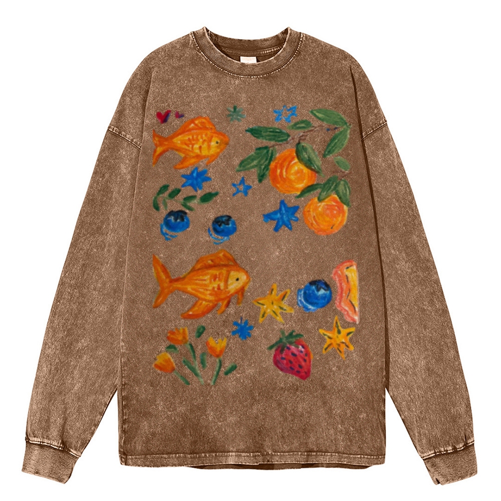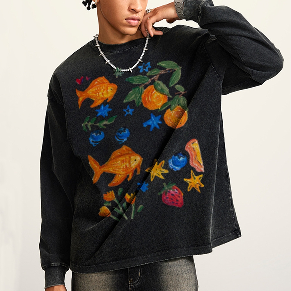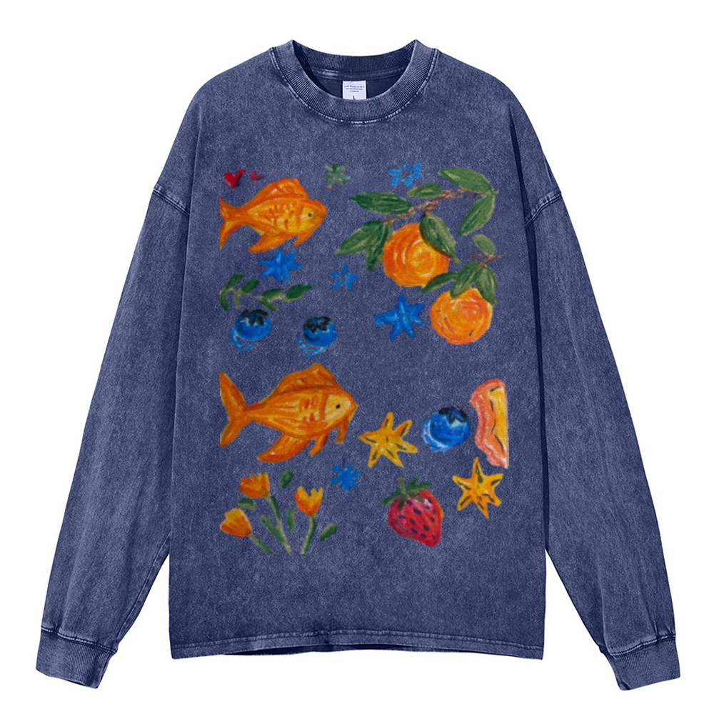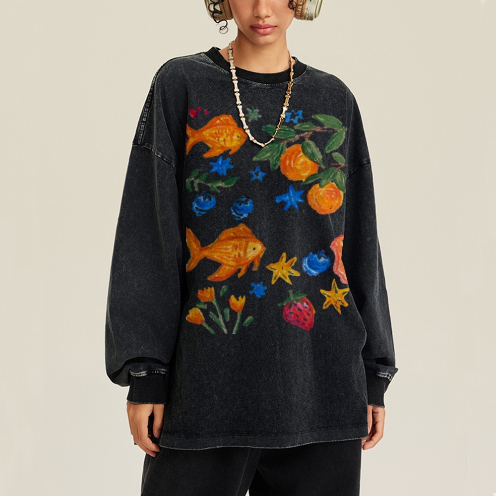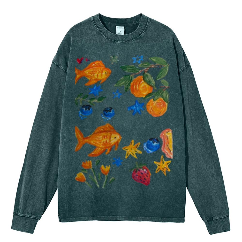 Goldfishes Joy Unisex Casual Washed Printed Long Sleeve T-shirt
