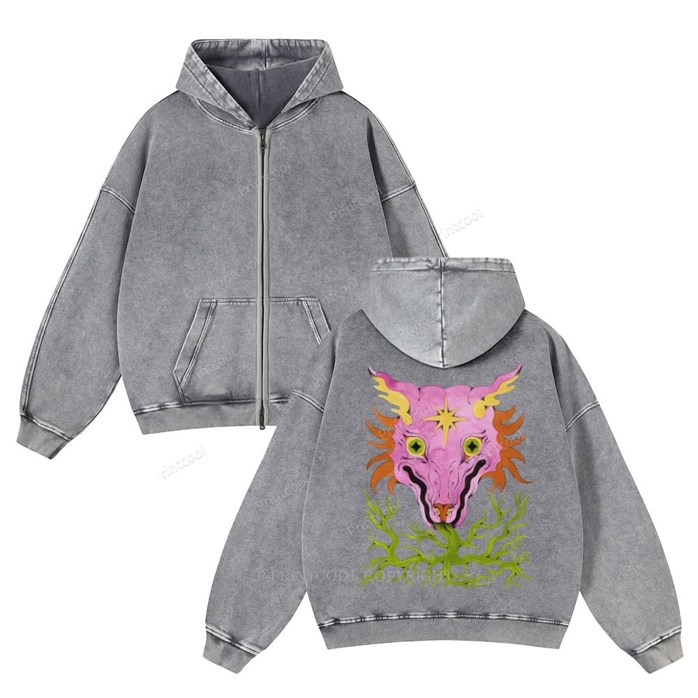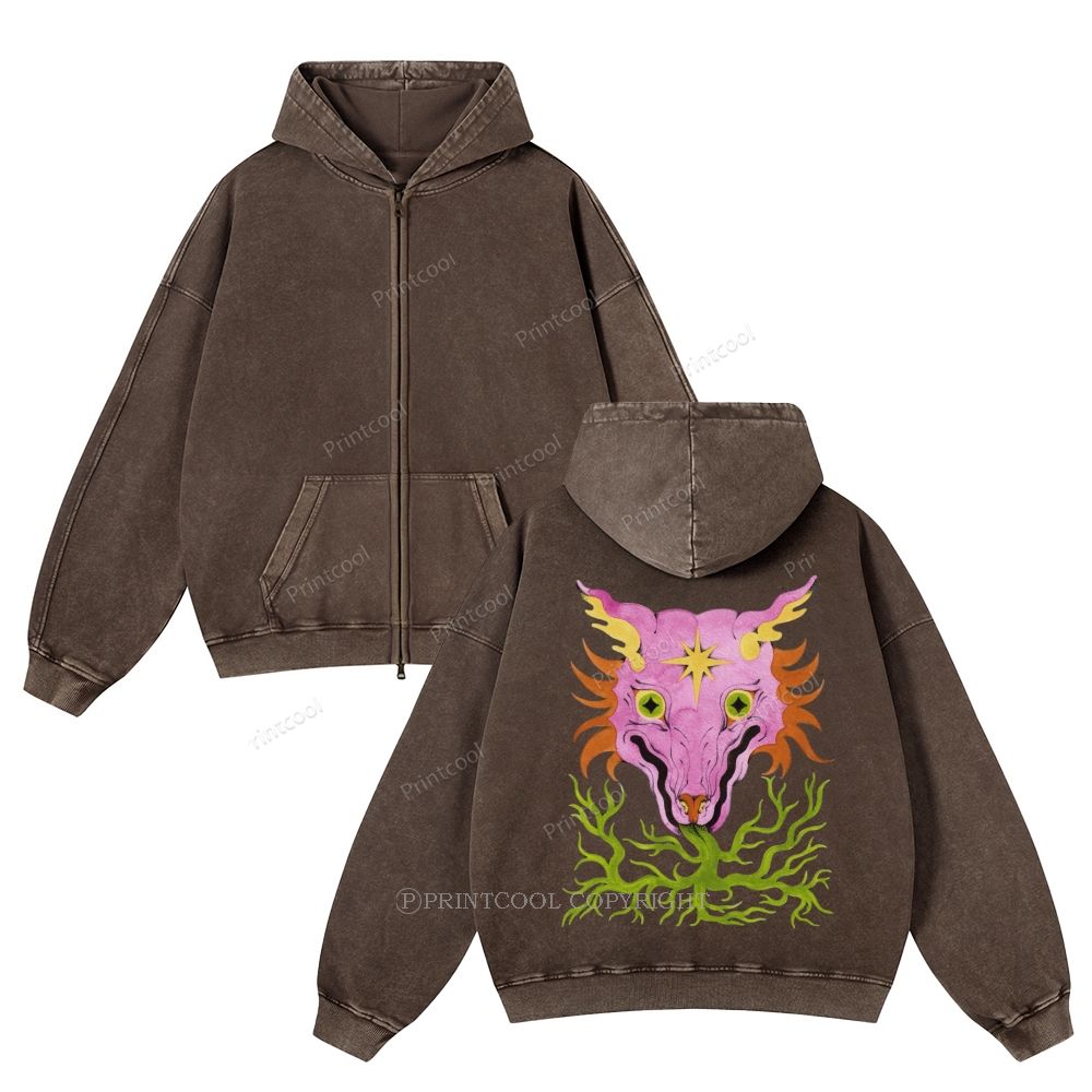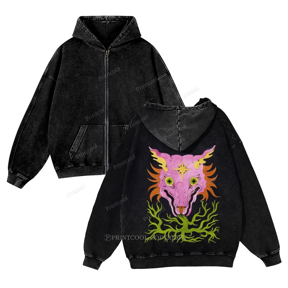 Horrible Mysterious Creature Unisex Washed Cotton Zip Up Hoodie