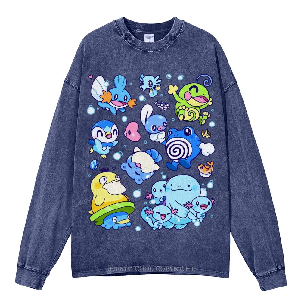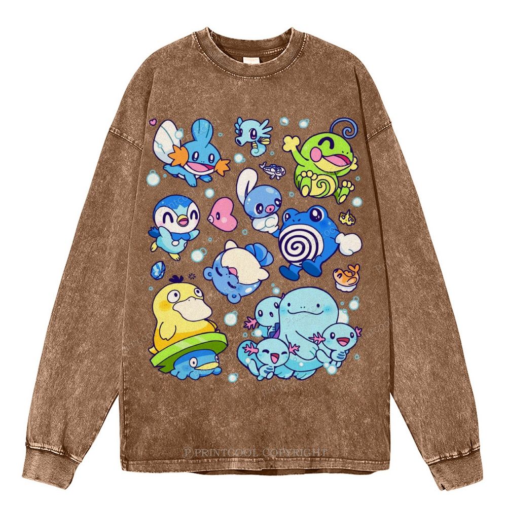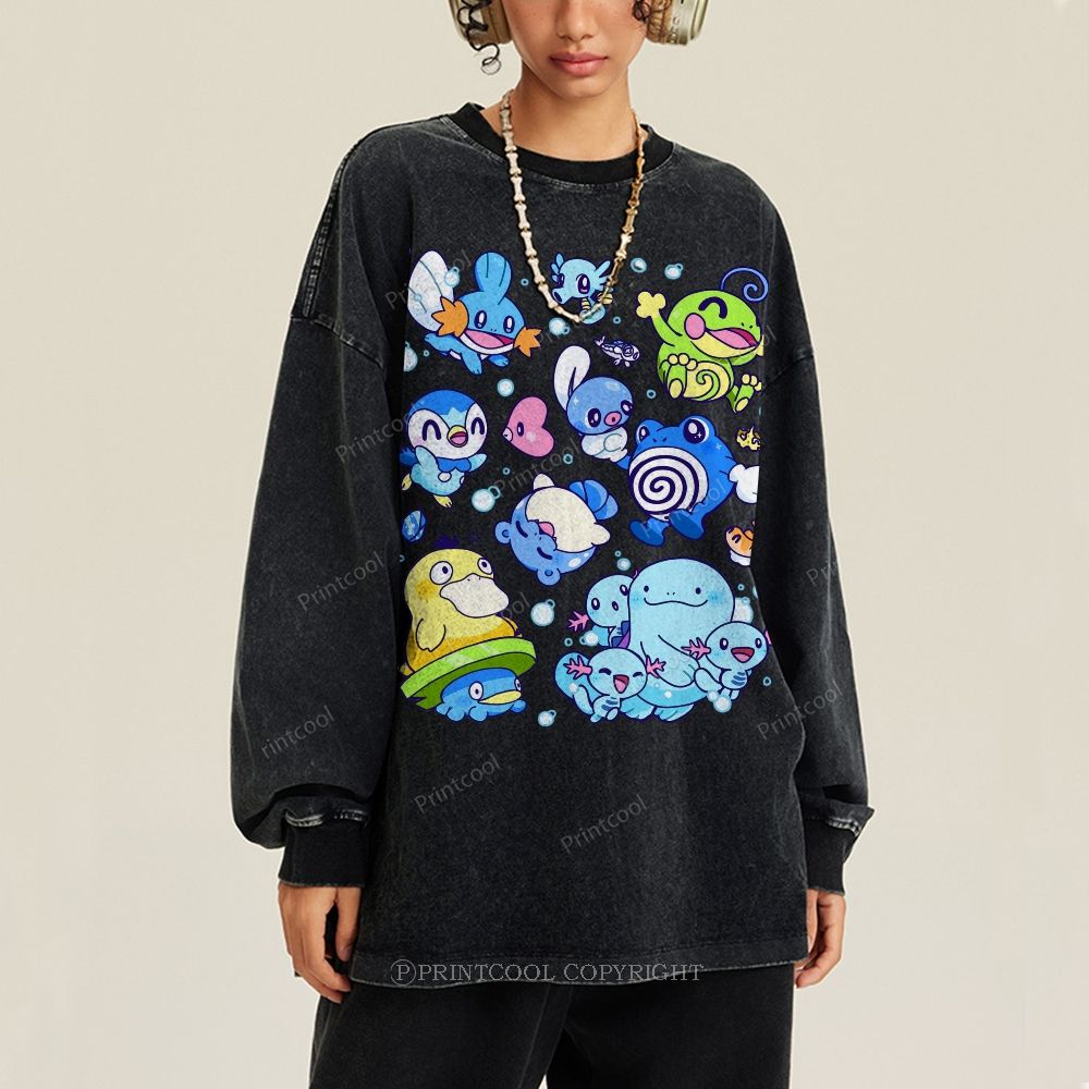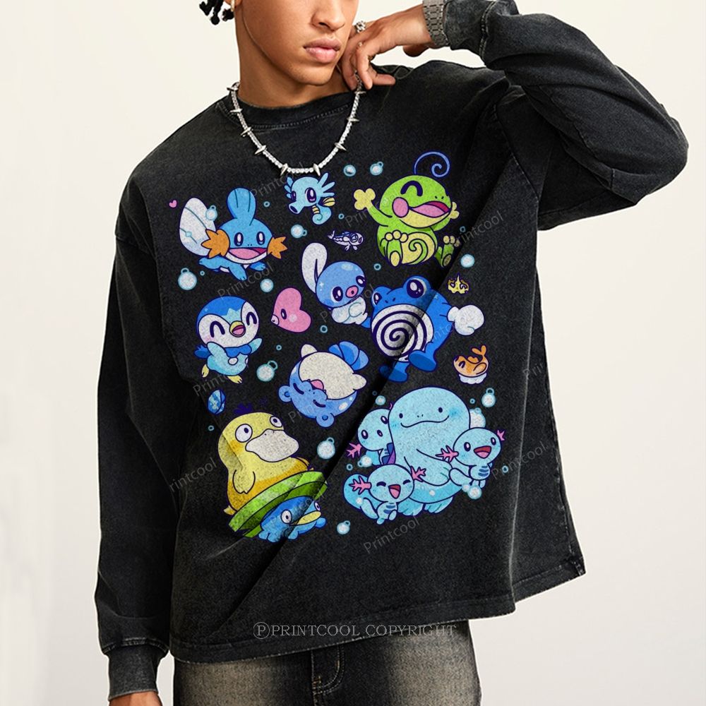 Pokémon Weaving Unisex Casual Washed Printed Long Sleeve T-shirt