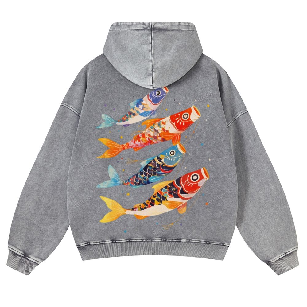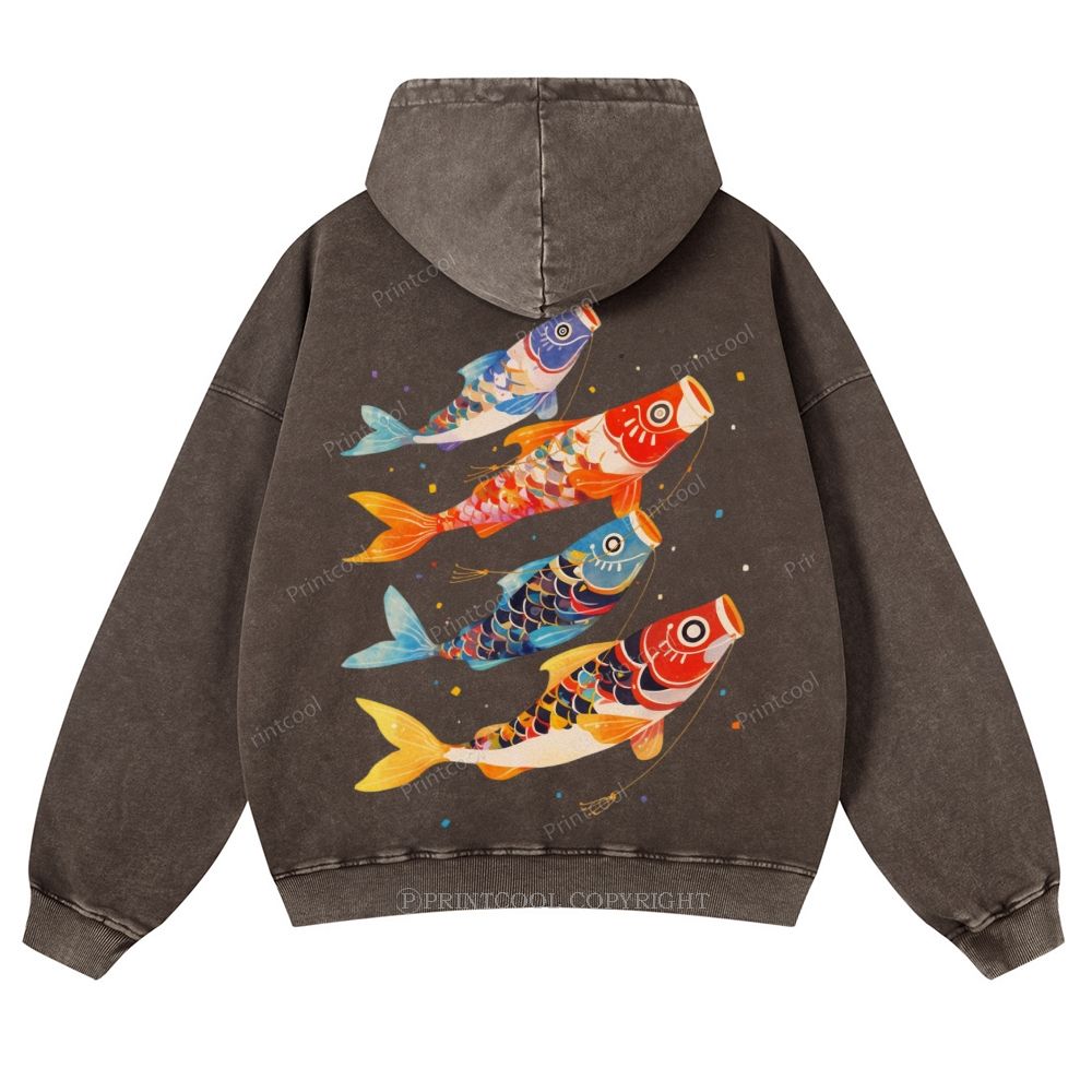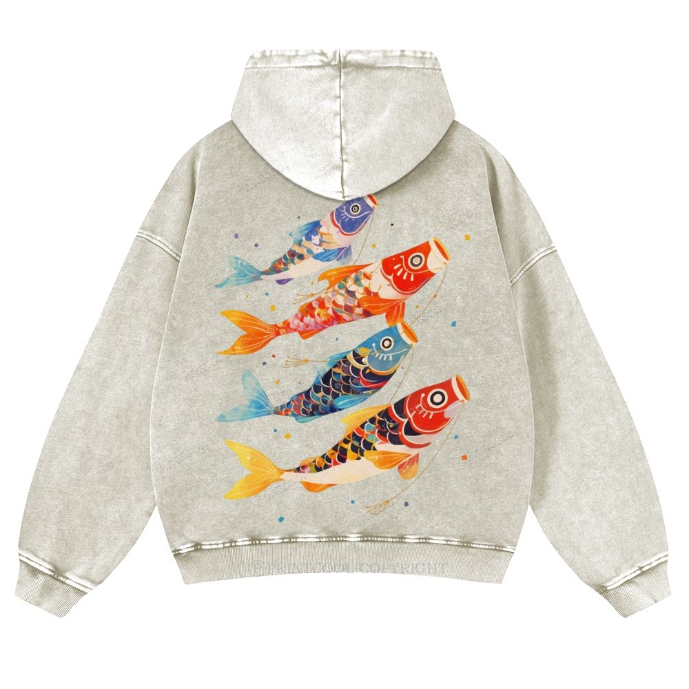Retro Japanese Koi Art Casual Washed Hoodie