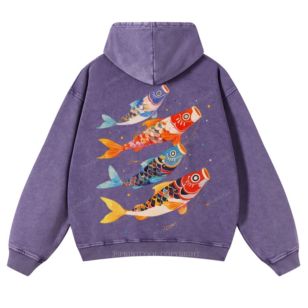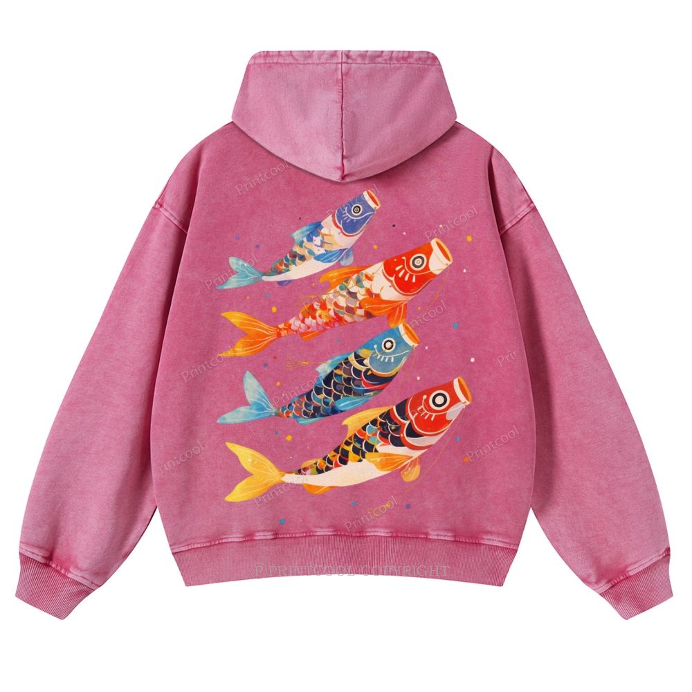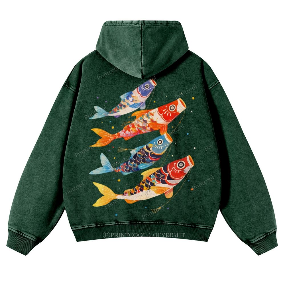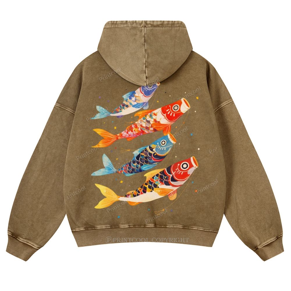 Retro Japanese Koi Art Casual Washed Hoodie