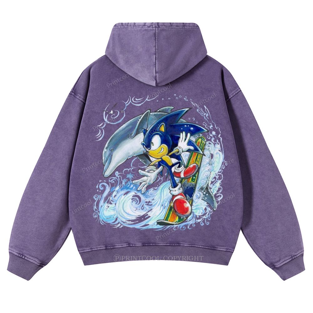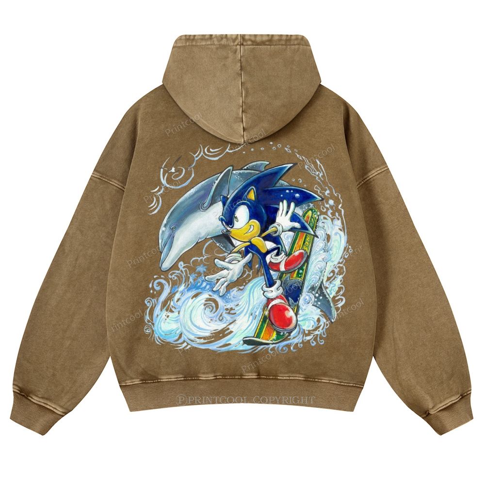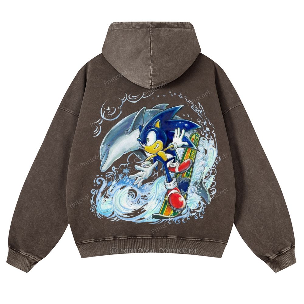 Sonic And Ecco's Wave Ocean Crossover Casual Washed Hoodie