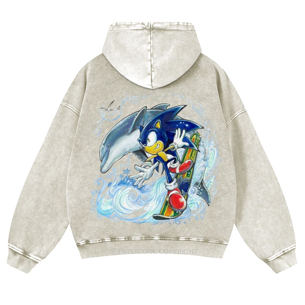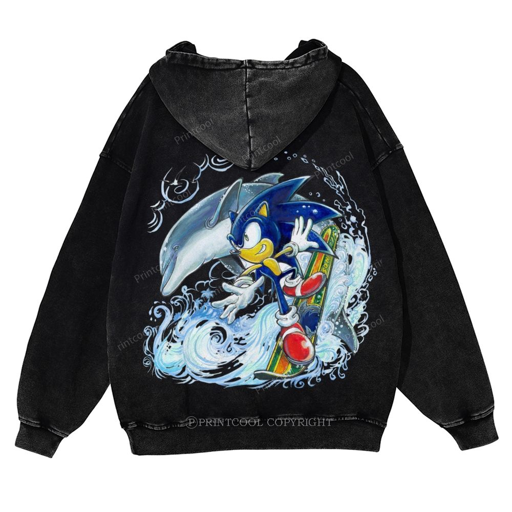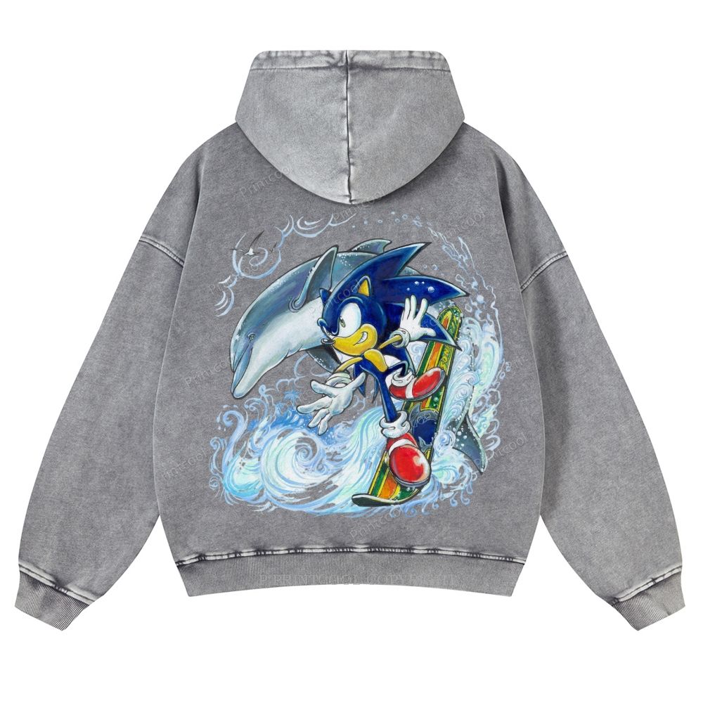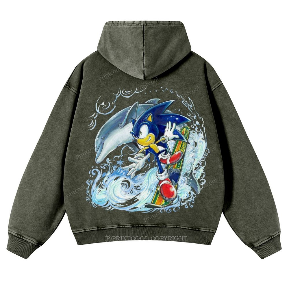 Sonic And Ecco's Wave Ocean Crossover Casual Washed Hoodie