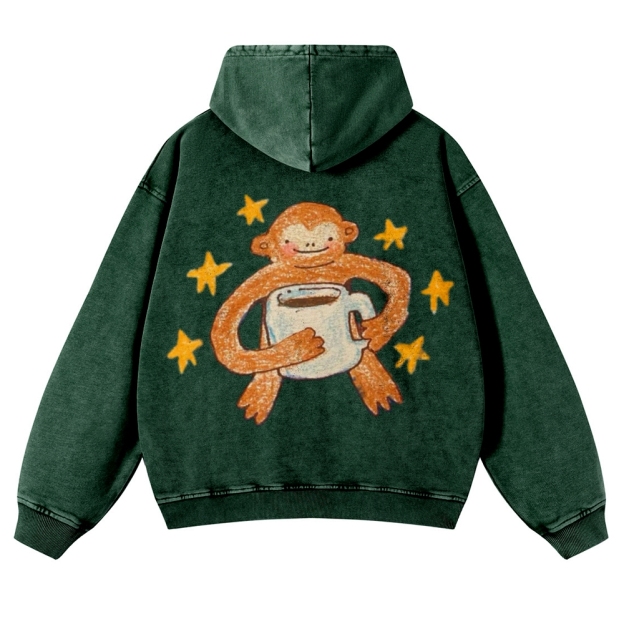 Star Monkey Back Print Casual Washed Hoodie
