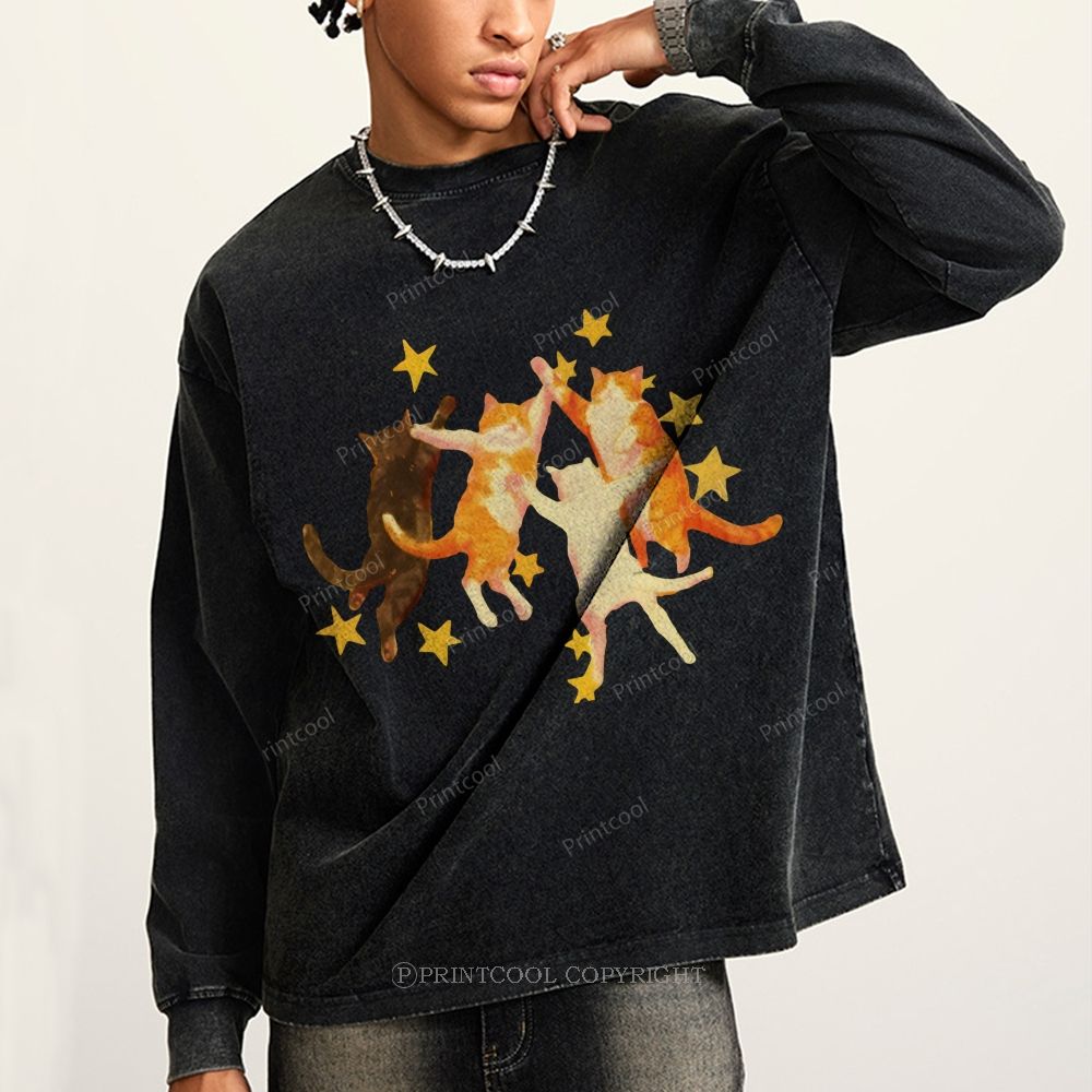 Starlight Dancing Cats Crew Unisex Casual Washed Printed Long Sleeve T-shirt