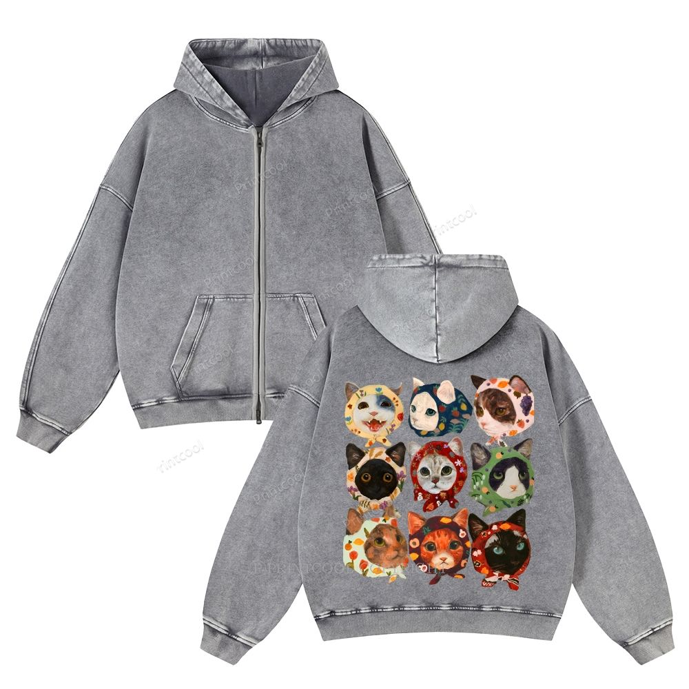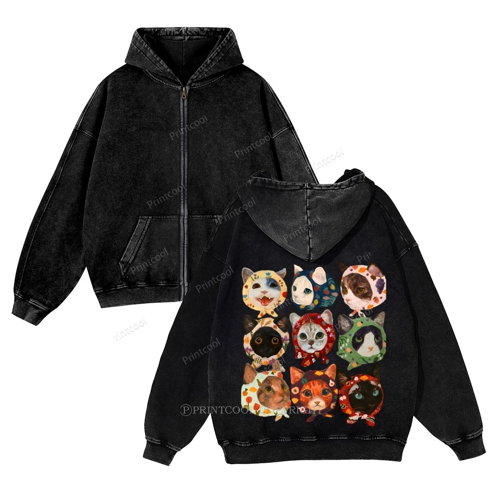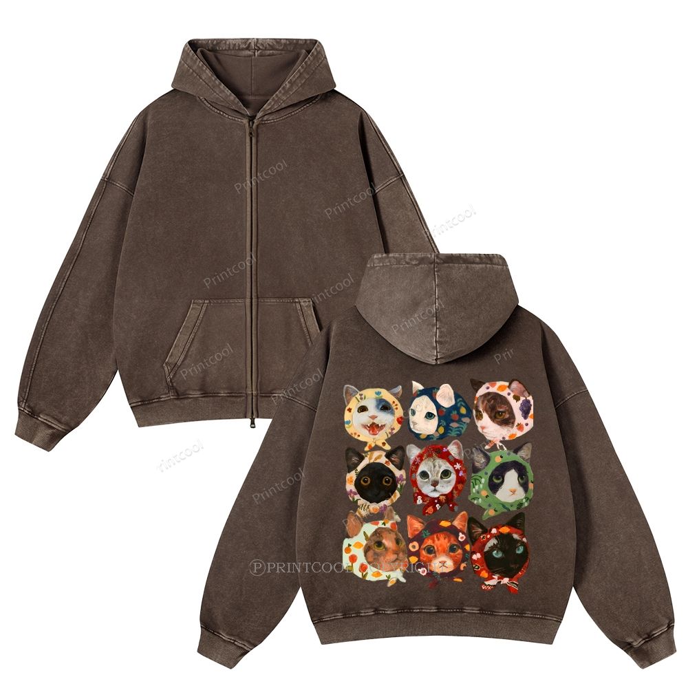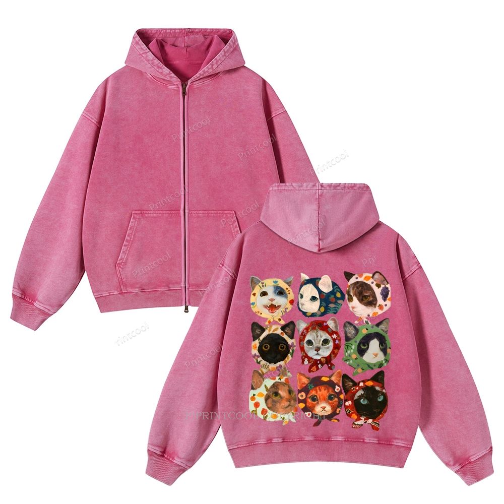 Turban Cat Unisex Washed Cotton Zip Up Hoodie