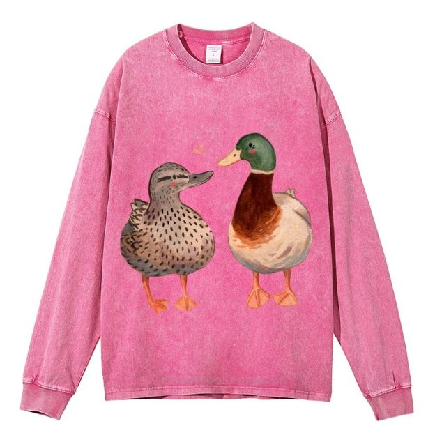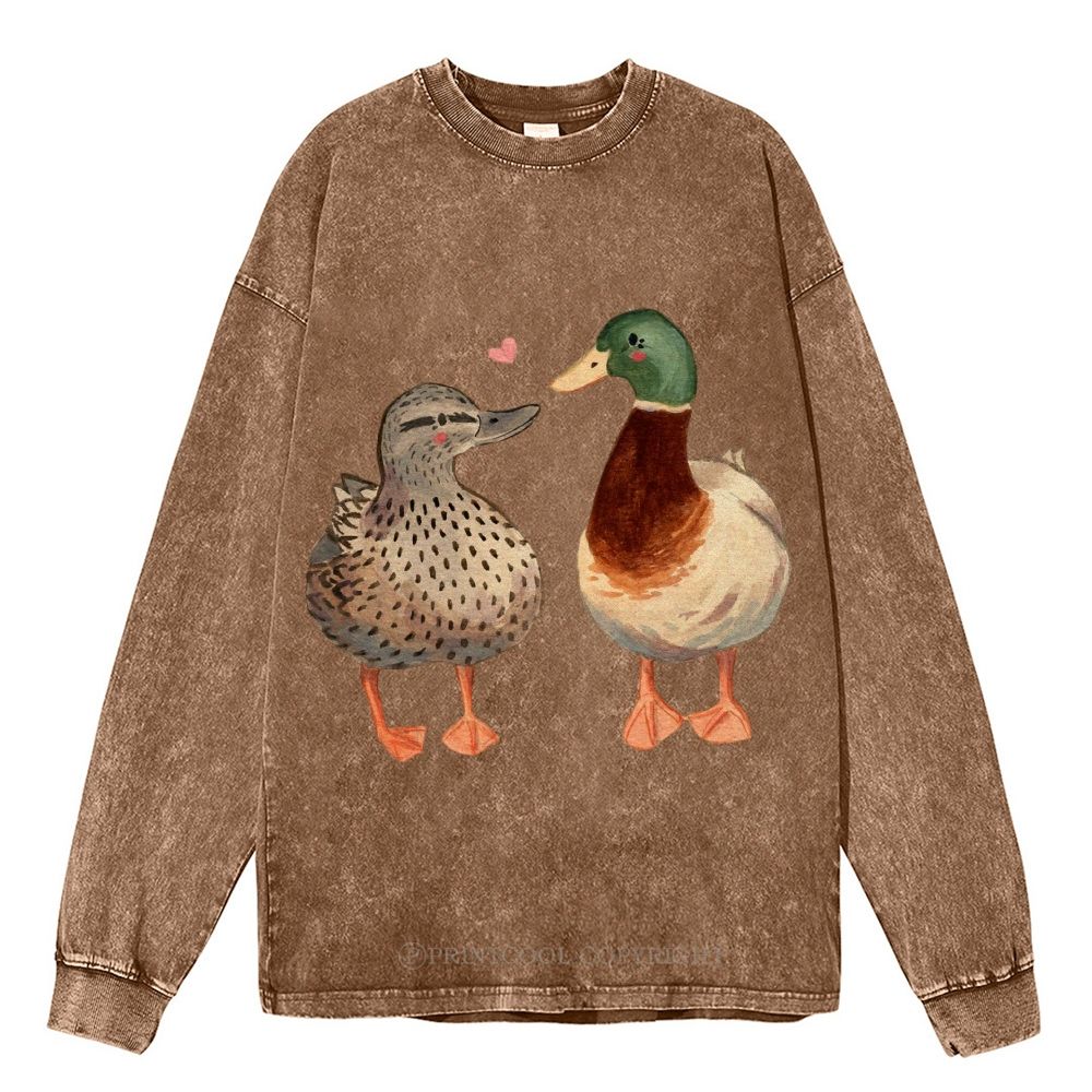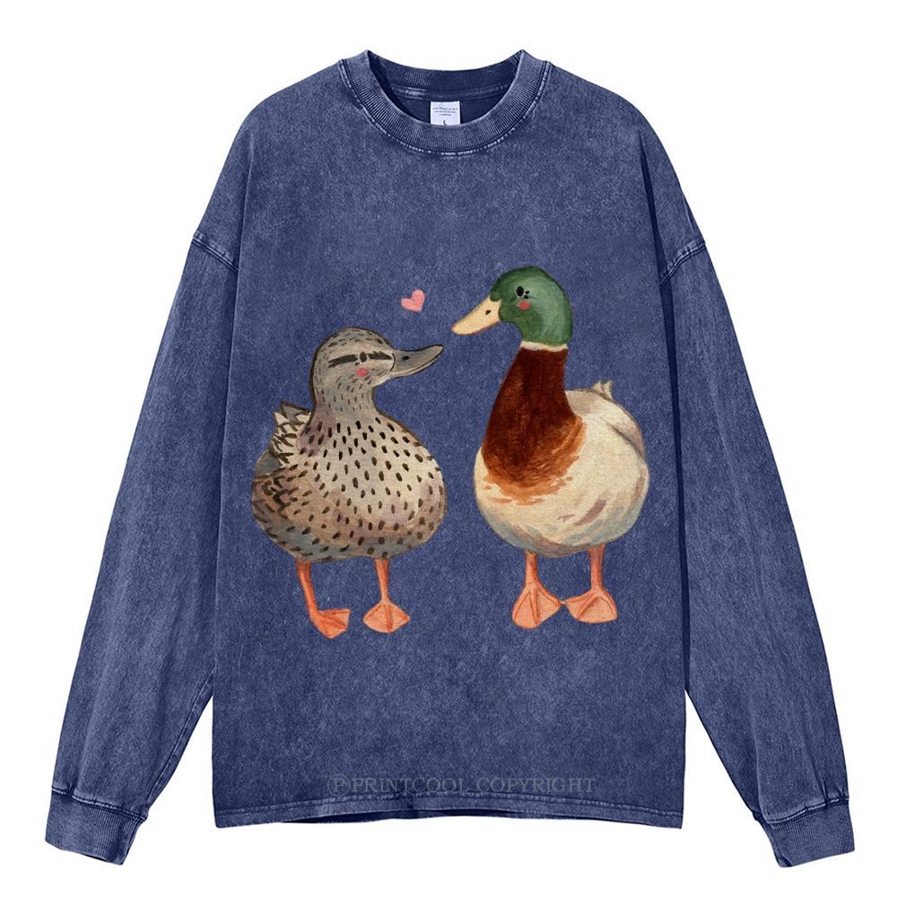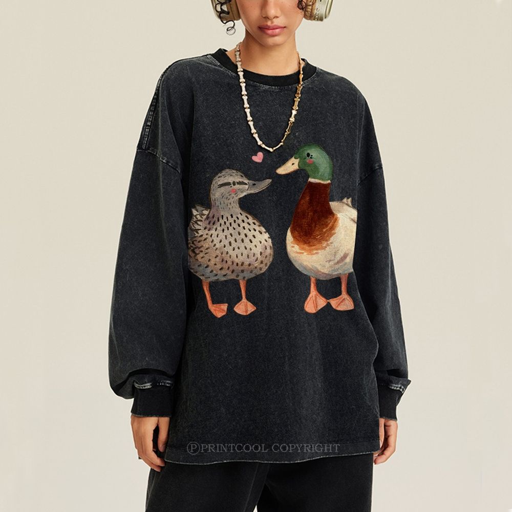Two Ducks Unisex Casual Washed Printed Long Sleeve T-shirt