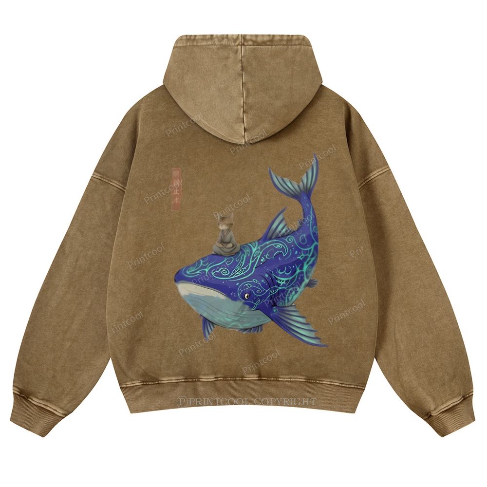 Zen Cat Whale Meditation Casual Washed Hoodie