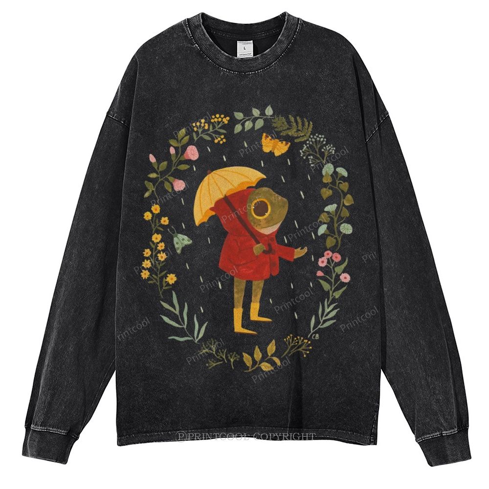 Frog Walking In The Rain Unisex Casual Washed Printed Long Sleeve T-shirt