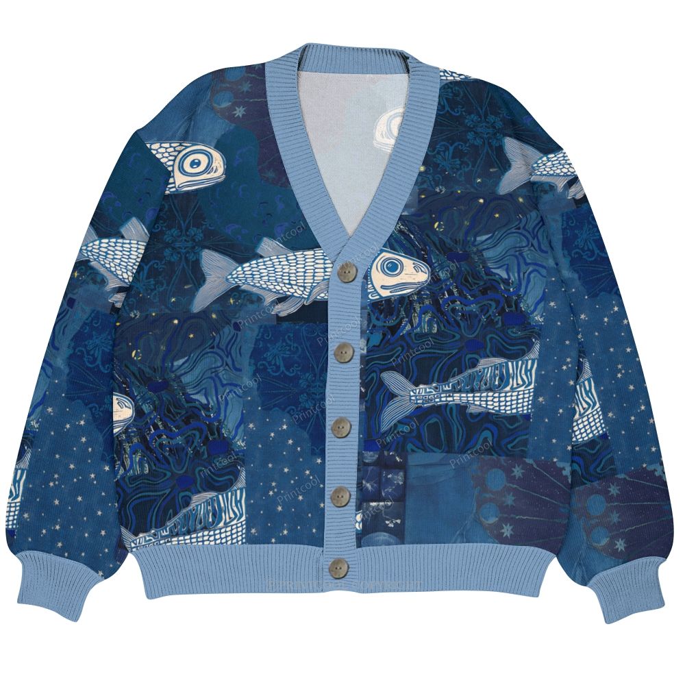Blue Fish And Starry Sky Collage Ugly Cardigan Sweater