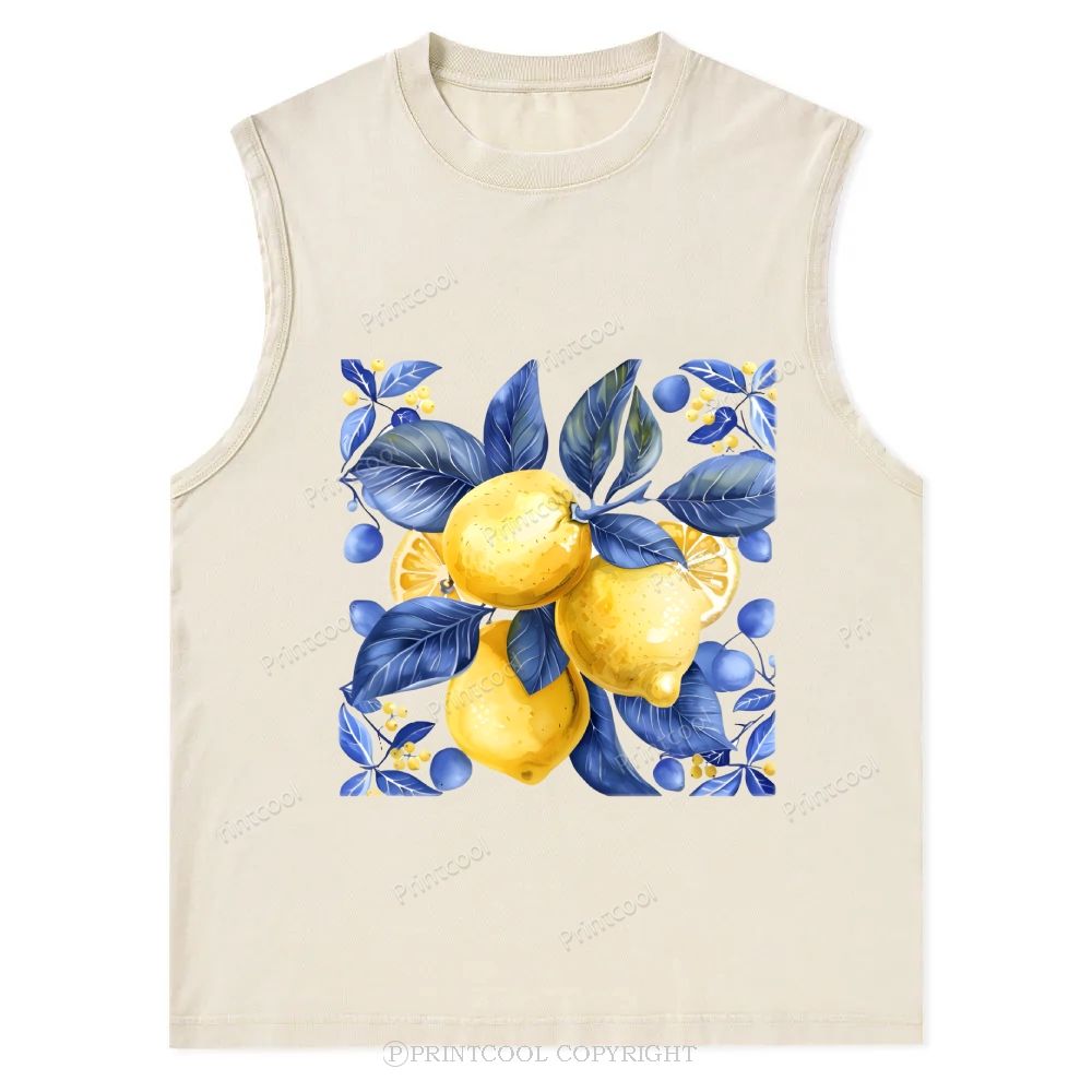 Mediterranean Blue Leaves Lemon Watercolor Unisex Washed Tank Top