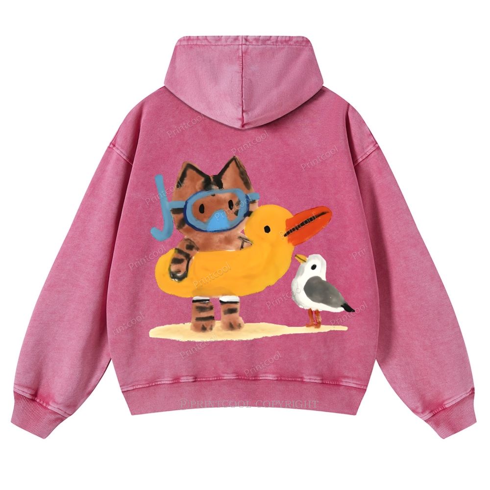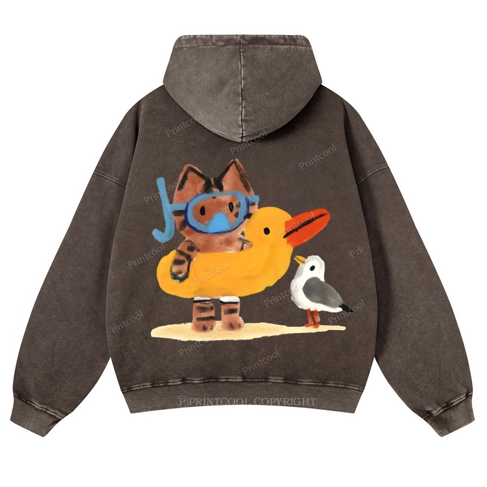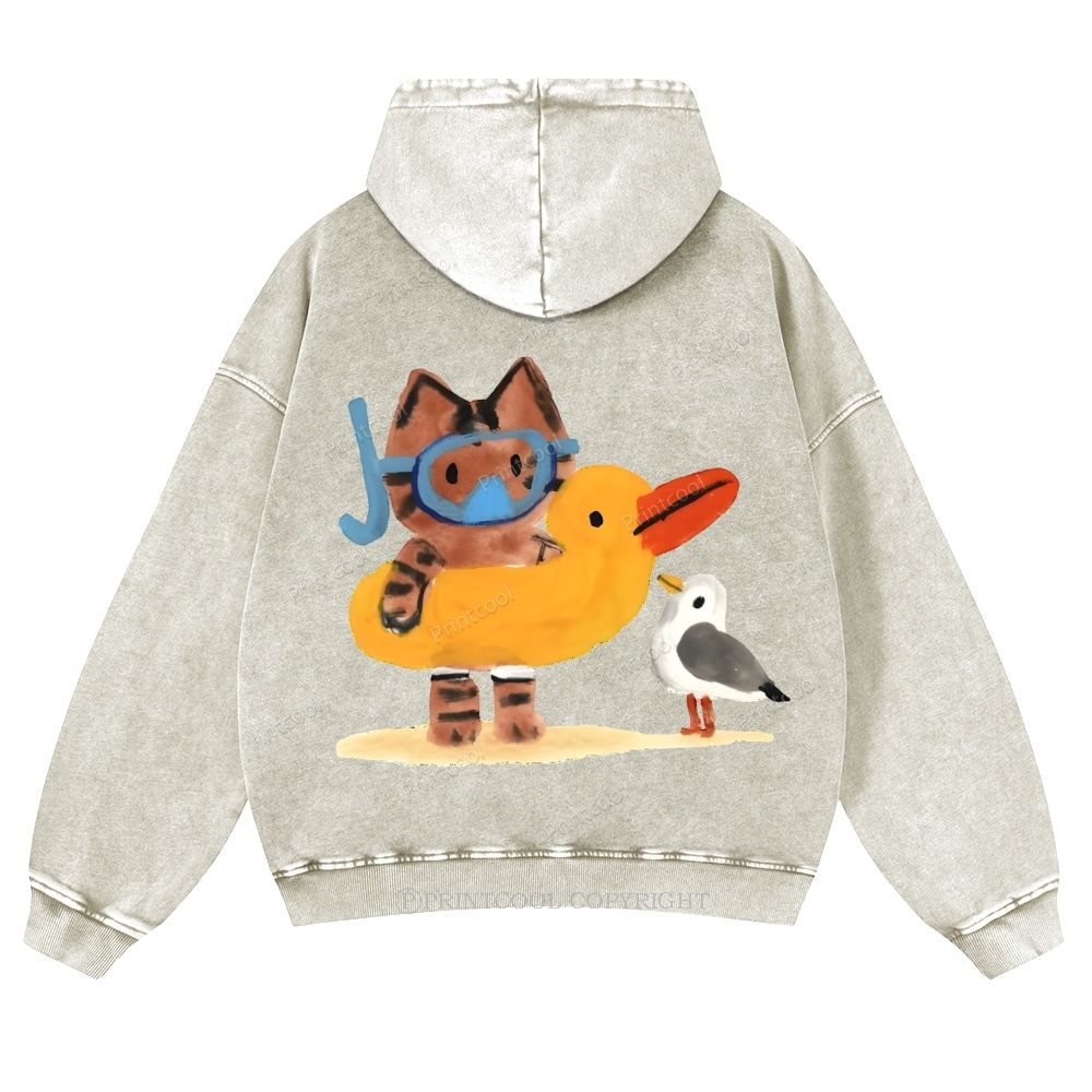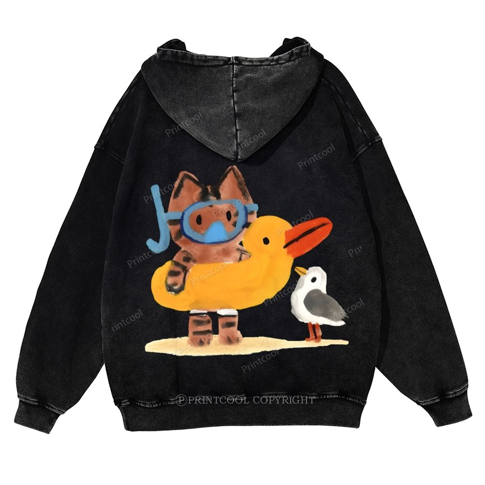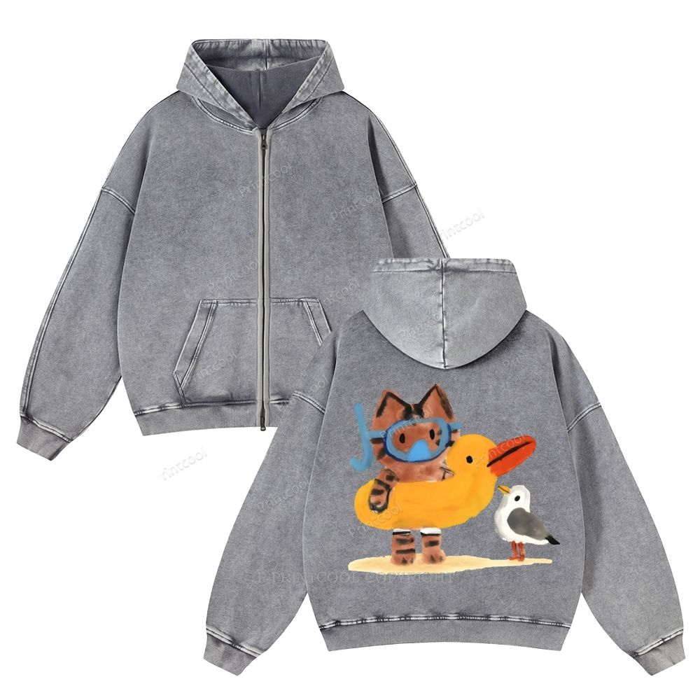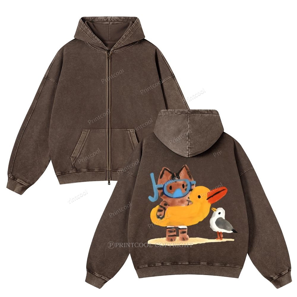 Cat And Seagull Unisex Washed Cotton Zip Up Hoodie