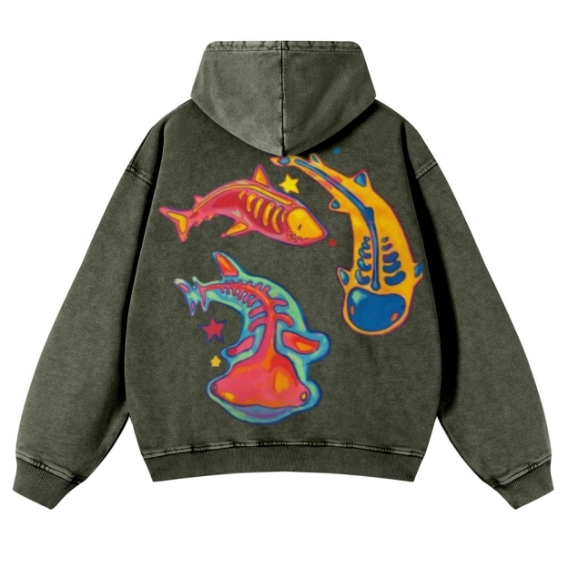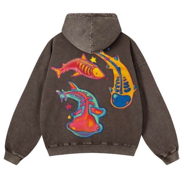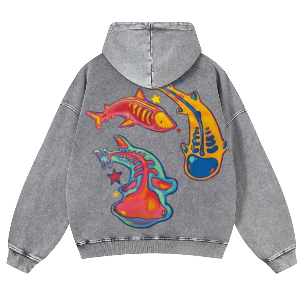 Enigma of Sharks Back Print Casual Washed Hoodie