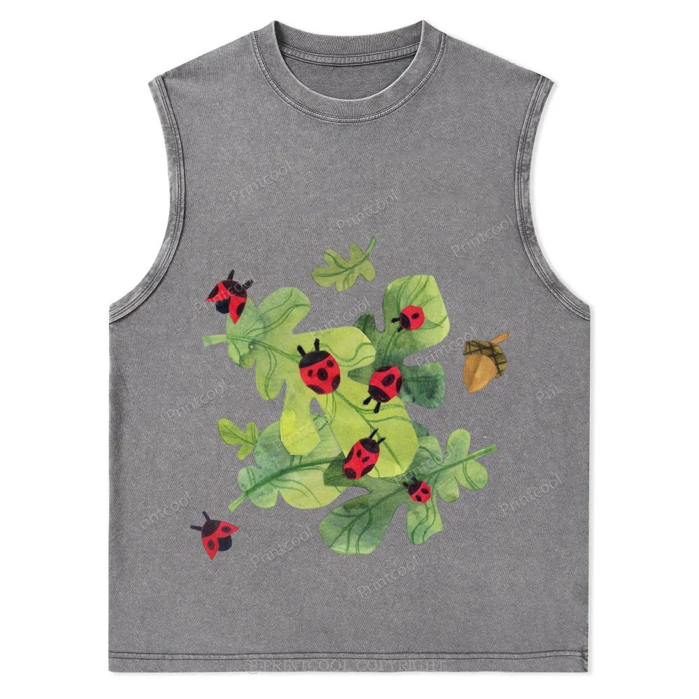 Ladybug On Green Leaves Unisex Washed Tank Top