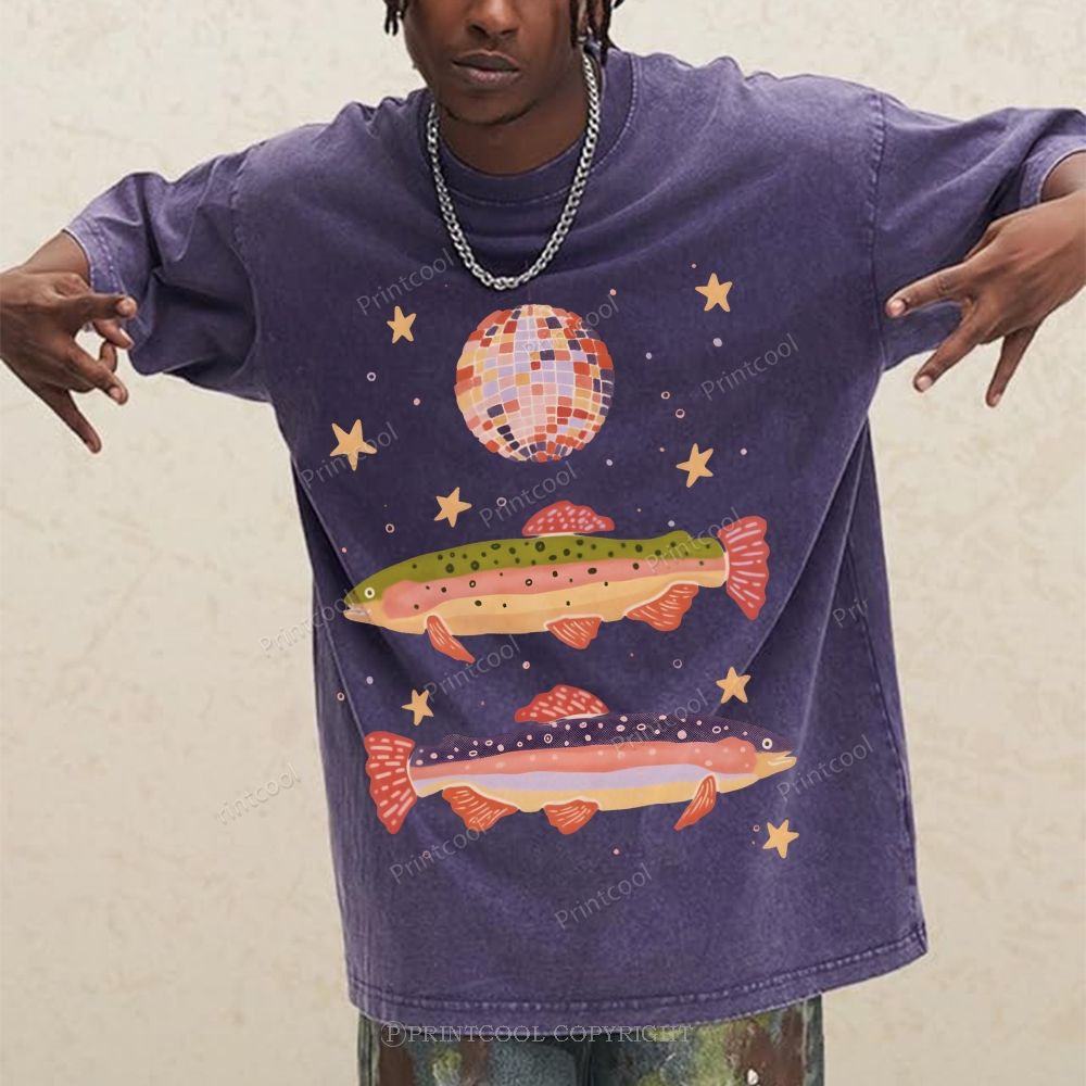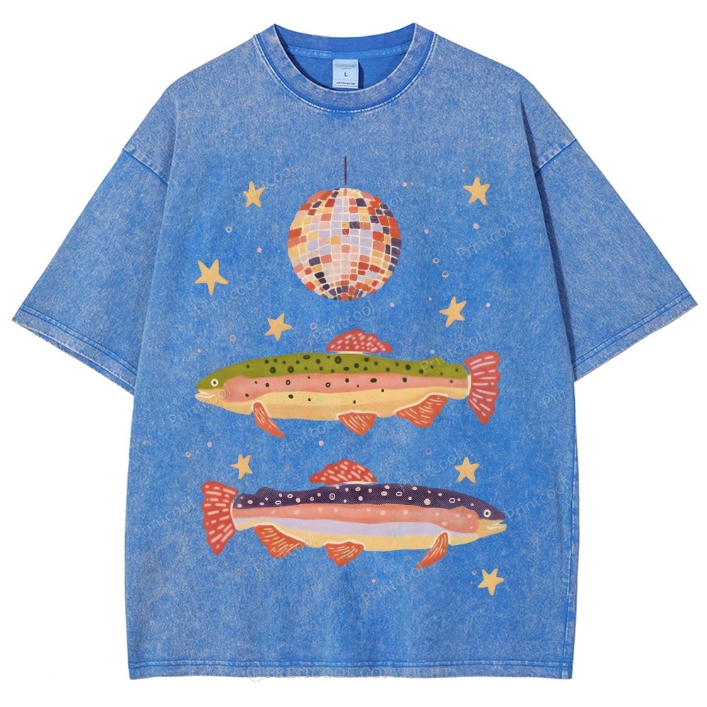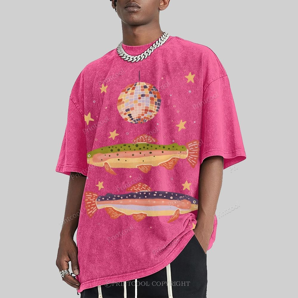 Rainbow Trout And Disco Ball Unisex Vintage Washed Tee